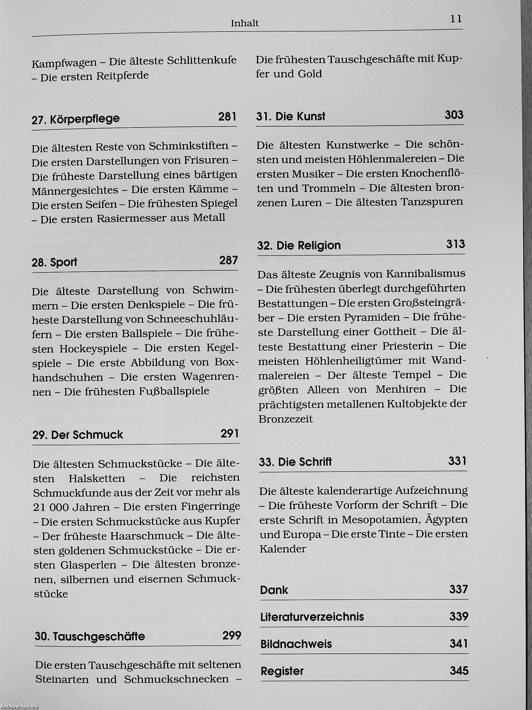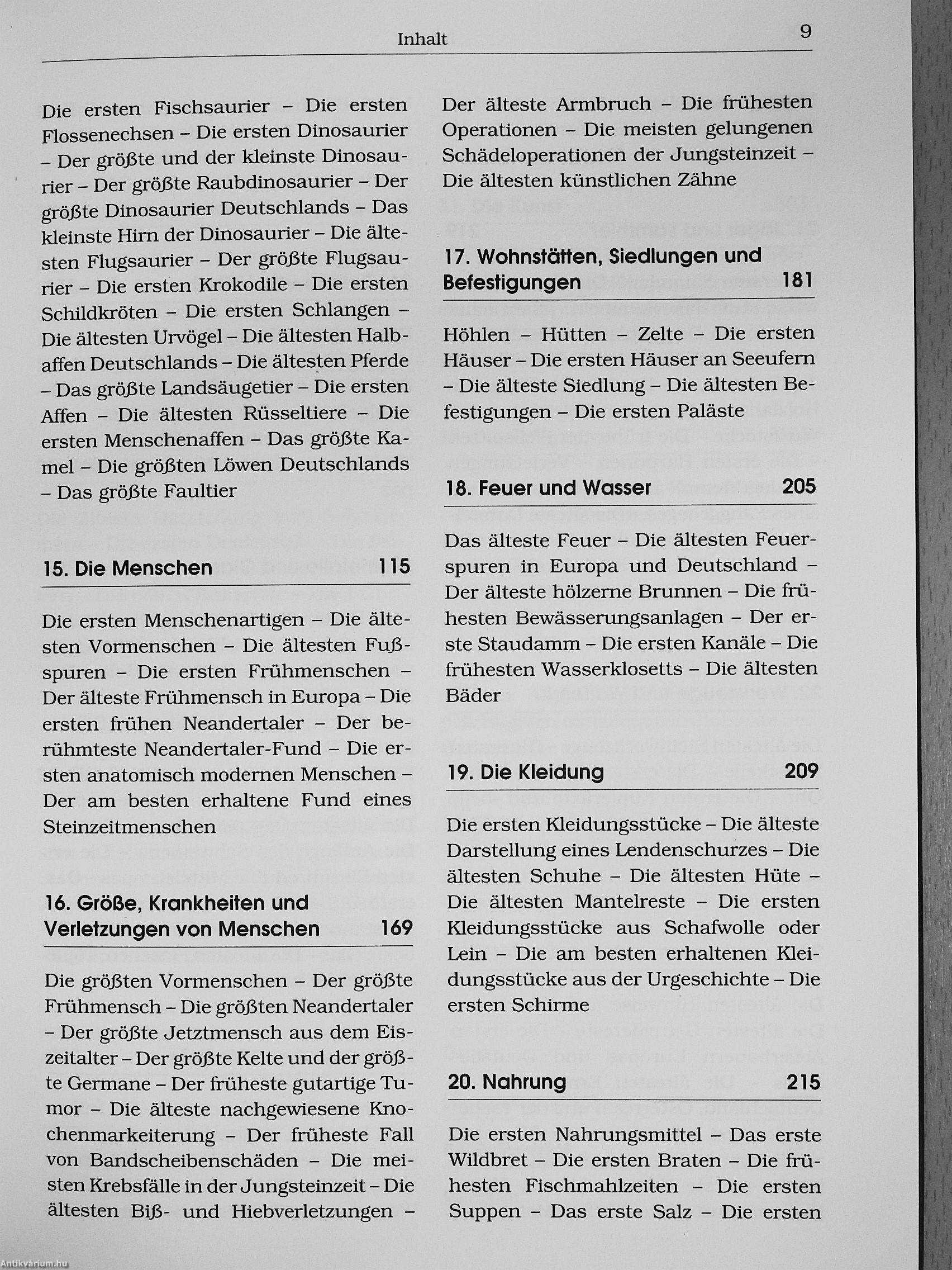 Die ersten Behausungen des Menschen werden ebenso behandelt wie die frühesten Siedlungen, Tempel, Möbel, Klei-dungs- und Schmuckstücke, Werkzeuge, Waffen, Haustiere und Kimstwerke. Außerdem erfahrt man viel über die Krankheiten, die ersten Operationen und die Medizinmäimer der Steinzeit.