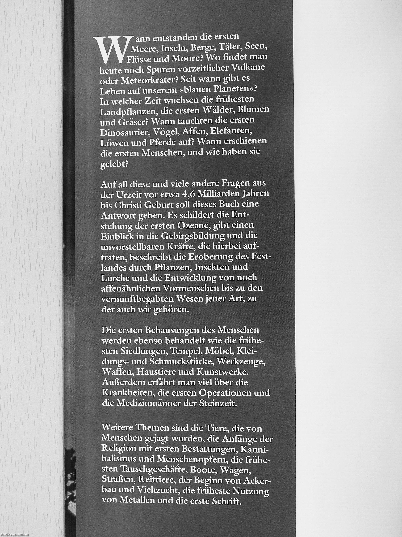 heute noch Spuren vorzeidicher Vulkane oder Meteorkrater? Seit wann gibt es Leben auf xmserem »blauen Planeten«? In welcher Zeit wuchsen die frühesten Landpflanzen, die ersten Wälder, Blumen und Gräser? Wann tauchten die ersten Dinosaurier, Vögel, Affen, Elefanten, Löwen und Pferde auf? Wann erschienen die ersten Menschen, und wie haben sie gelebt?