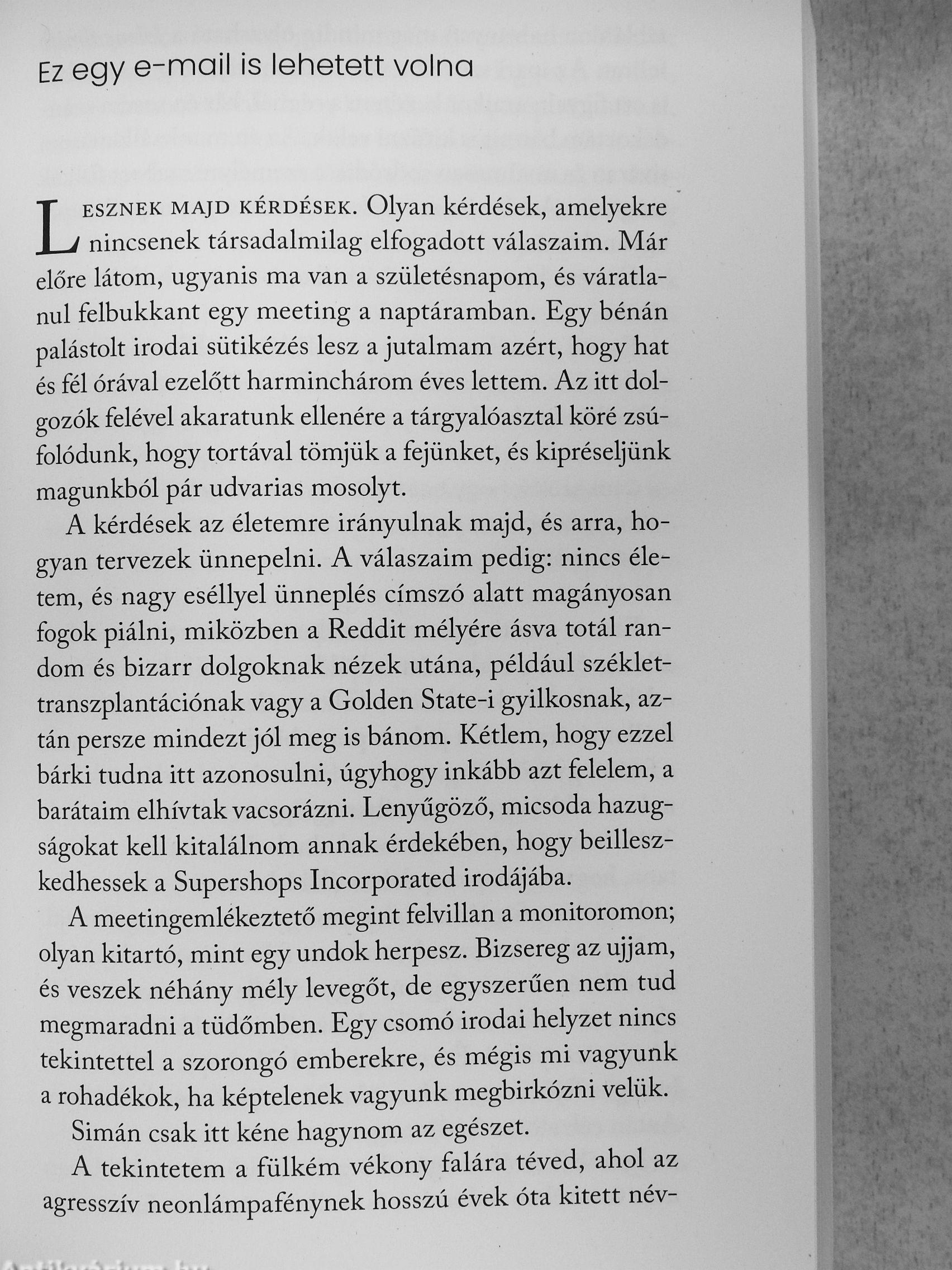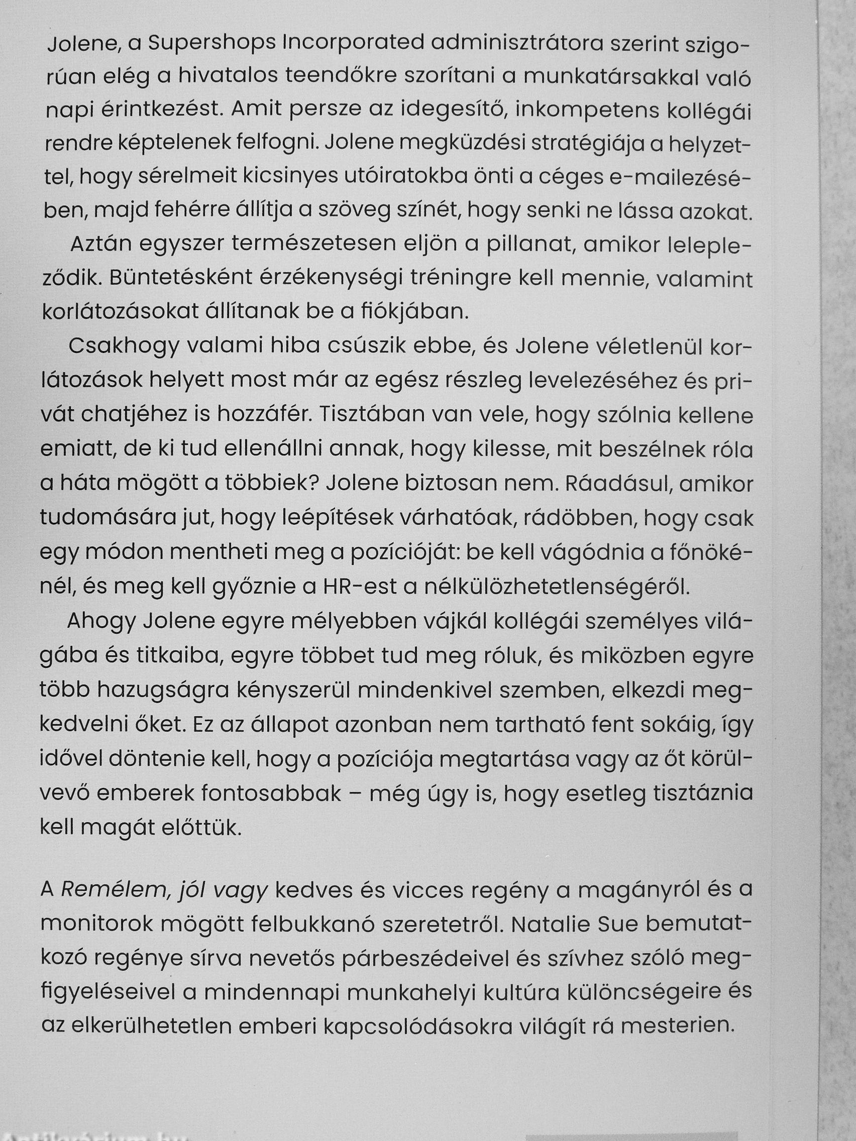 A Remélem, jól vagy kedves és vicces regény a magányról és a monitorok mögött felbukkanó szeretetről. Natalie Sue bemutatkozó regénye sírva nevetős párbeszédeivel és szívhez szóló megfigyeléseivel a mindennapi munkahelyi kultúra különcségeire és az elkerülhetetlen emberi kapcsolódásokra világít rá mesterien.