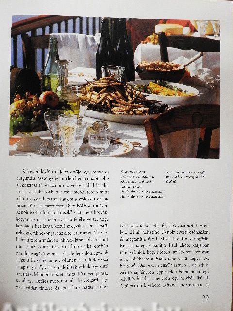 A Művésztársaságban sorozat Renoirról szóló kötetéből szinte árad, hogy az impresszionisták mennyire szerették az életet, és mennyire tudtak is élni. Szajna-parti kertvendéglőkben, nyüzsgő boulevárd-okon, művészek körében elköltött vacsorák, puccos társasági összejövetelek Párizs krémjével: Renoirnak mindebben része volt, majd meg is festette élményeit. Az evezősök ebédje, A zongorázó lányok, a pazar virágcsokrok mind-mind az egykori szép időket idézik. Renoir Champagne és Burgundia határán, Essoyes-ban, majd a delelő nap fényénél, Collettes-ben találja meg azt a családi fészket, ahol mindig szívesen látják a betérő vendéget. Ide zarándokolnak a rajongók, hogy személyesen találkozzanak a mesterrel, és hogy megkóstolják Aline-nak, feleségének főztjét. A könyvünkhöz válogatott receptek arról tanúskodnak, hogy a nagy impresszionista művész az egyszerű, tájjellegű ételeket kedvelte. A könyv szerzőjét szinte elvarázsolta a festőóriás életműve, amikor megkísérelte, hogy Renoir életének valódi színtereit bemutatva érzékeltesse művészetét, a kor hangulatát és szellemiségét...