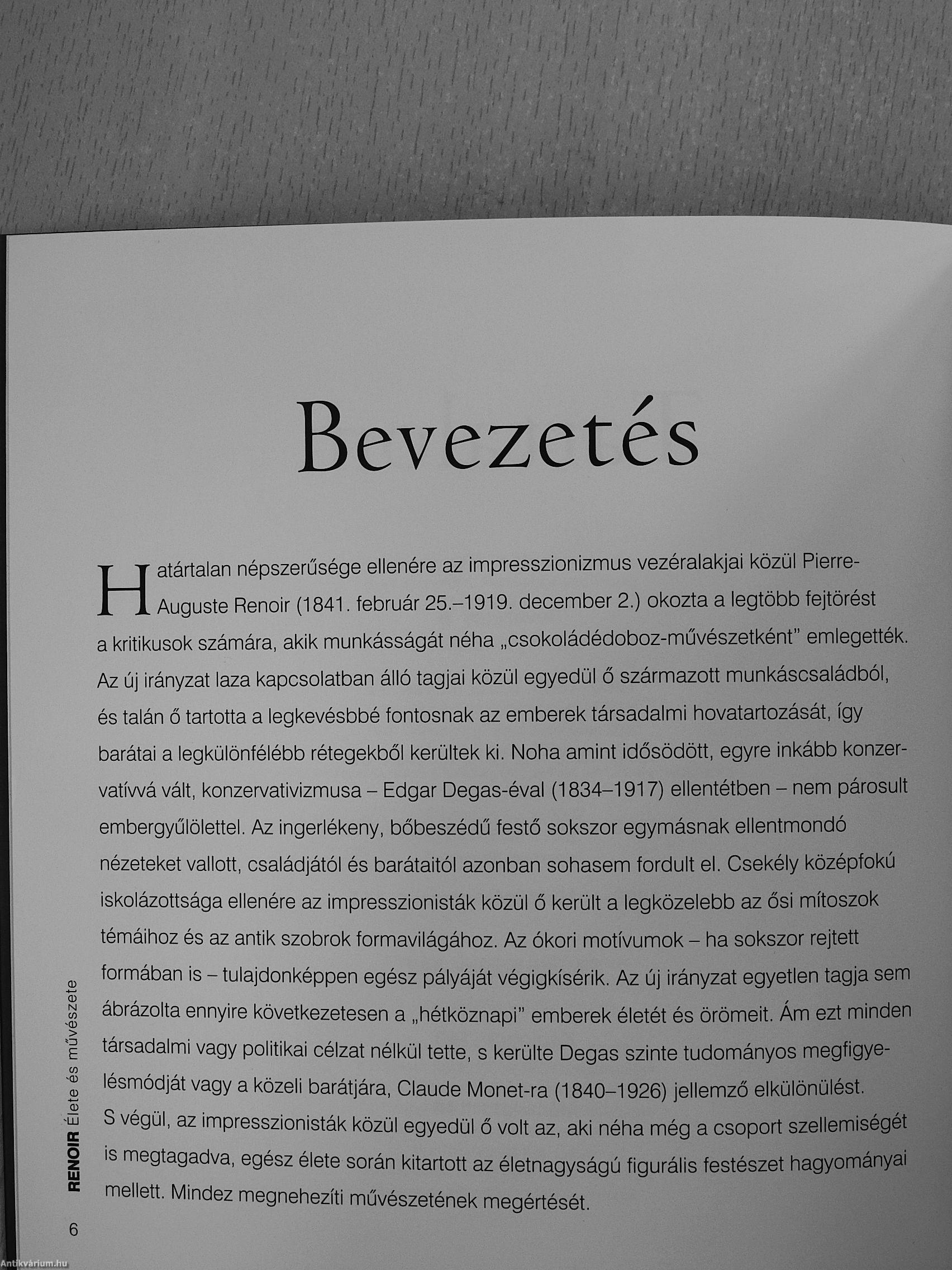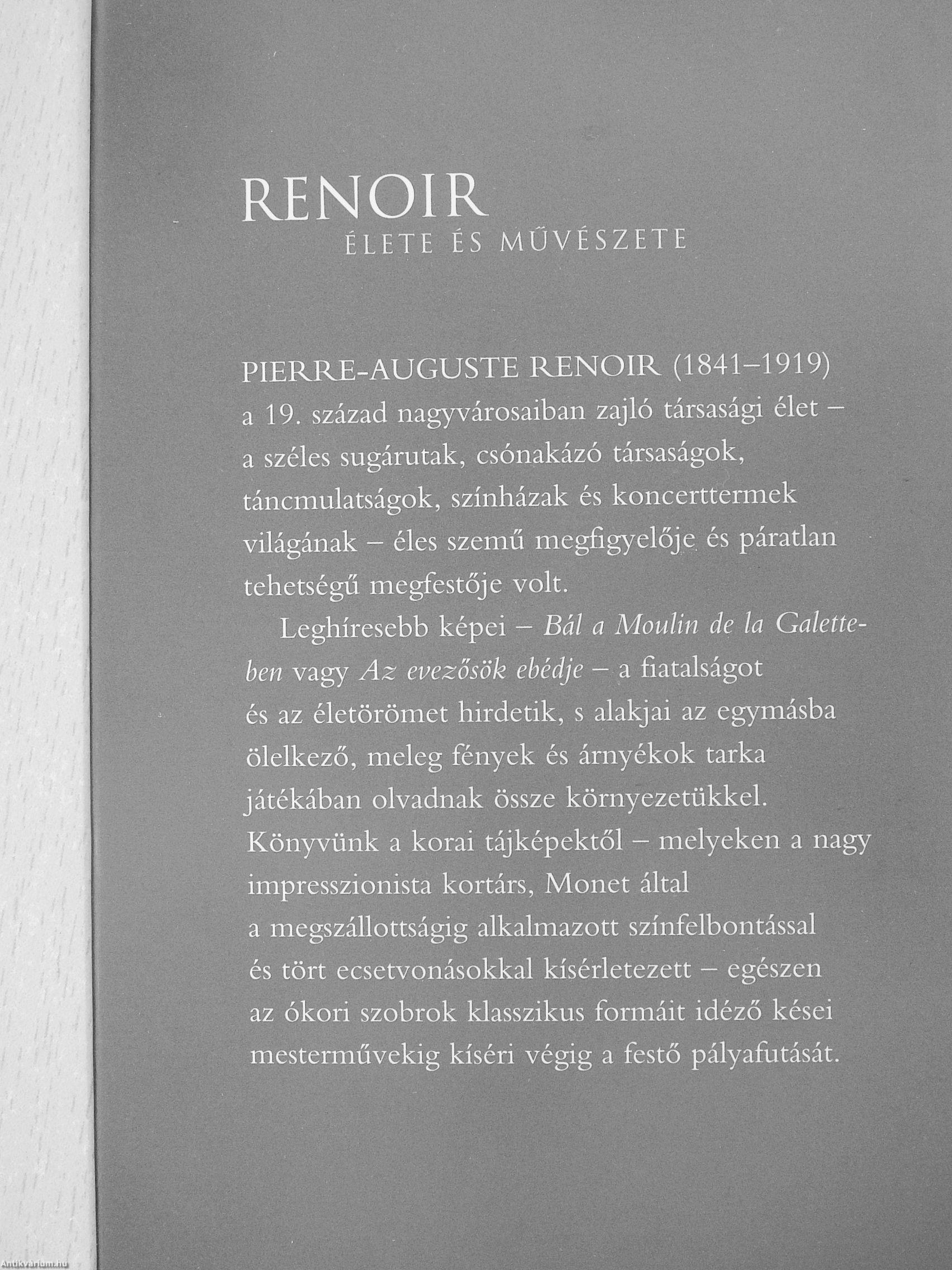 Leghíresebb képei - Bál a Moulin de la Galette-ben vagy Az evezősök ebédje - a fiatalságot és az életörömet hirdetik, s alakjai az egymásba ölelkező, meleg fények és árnyékok tarka játékában olvadnak össze környezetükkel. Könyvünk a korai tájképektől - melyeken a nagy impresszionista kortárs, Monet által a megszállottságig alkalmazott színfelbontással és tört ecsetvonásokkal kísérletezett — egészen az ókori szobrok klasszikus formáit idéző kései mesterművekig kíséri végig a festő pályafutását.