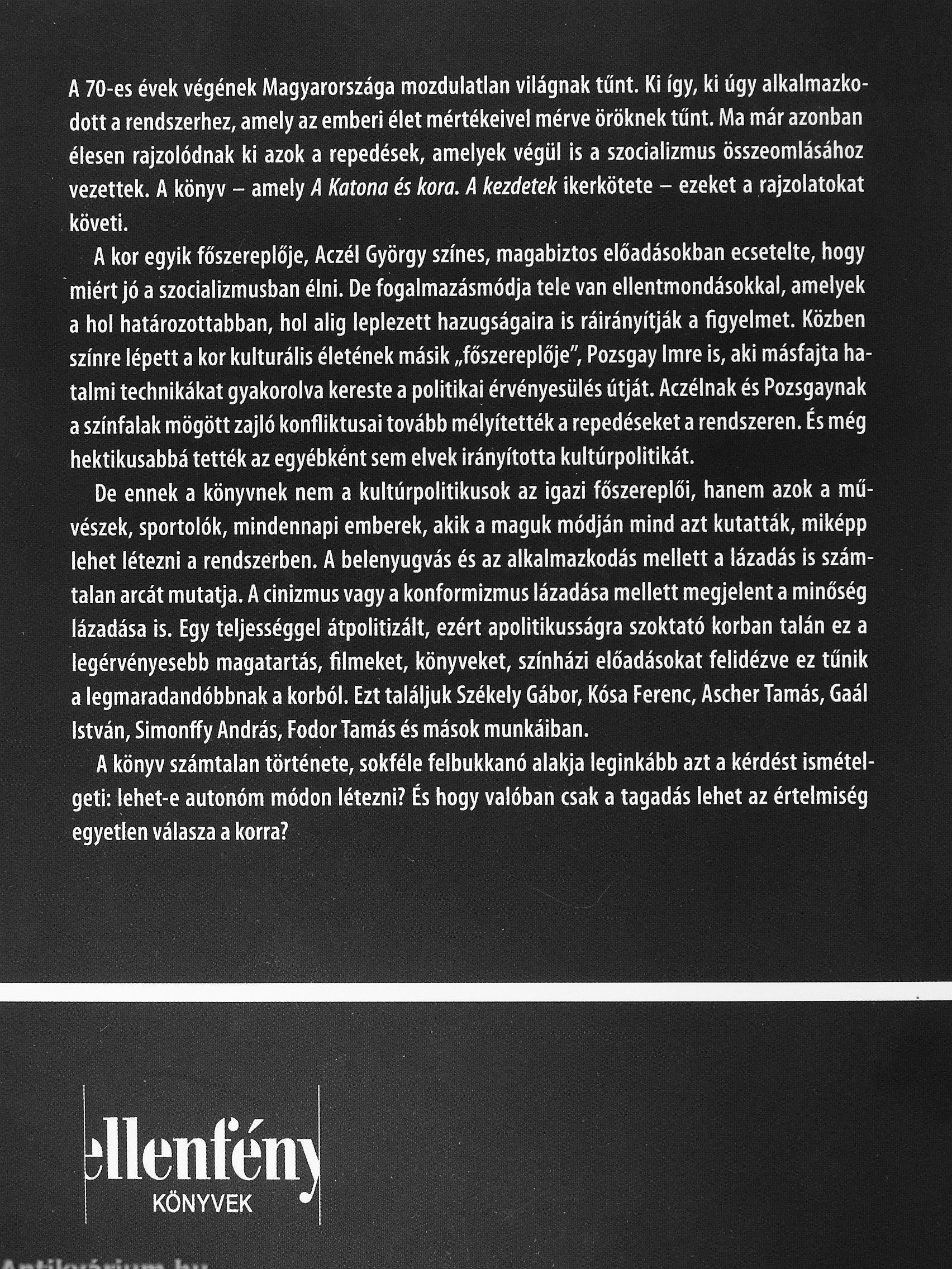 A 70-es évek végének Magyarországa mozdulatlan világnak tűnt. Ki így, ki úgy alkalmazkodott a rendszerhez, amely az emberi élet mértékeivel mérve öröknek tűnt. Ma már azonban élesen rajzolódnak ki azok a repedések, amelyek végül is a szocializmus összeomlásához vezettek. A könyv - amely k Katona és kora. A kezdetek ikerkötete - ezeket a rajzolatokat követi.