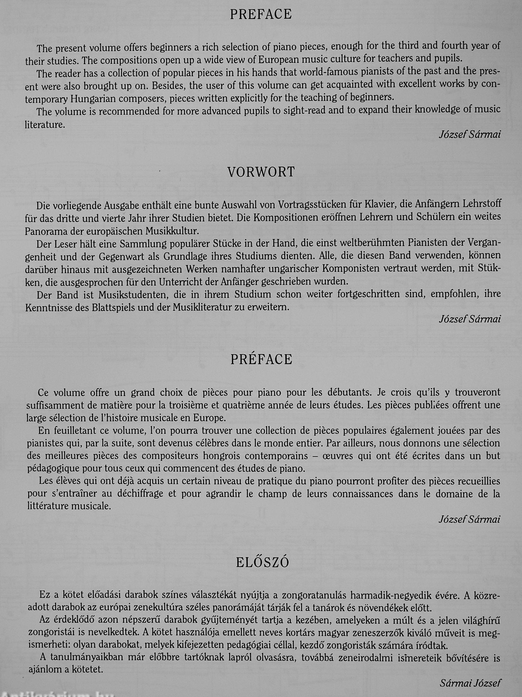 VOL. 4 (Z. 14 210, Csurka) J. S. Bach: Fughetta, BWV 961; Inventio in C major, BWV 772, in A minor, BWV 784, in F major, BWV 779; Prelude in E major, BWV 937; L. van Beethoven: Bagatelle in F major, op. 33 no. 3; Six Ecossaises, WoO 83; Sonata in 0 major, op. 49 no. 2; F. Chopin: Mazurka, op. 68 no. 2; C. Debussy: The Little Shepherd; G. Faúré: Romance, op. 17 no. 3; E. Grieg: Arietta, op. 12 no. 1; G. F. Handel: Courante, HWV 448/ III;./. Haydn: Adagio, Hob. XIX:9; Sonata in A major, Hob. XVI:I2; F. Mendelssohn-Bartholdy: Lied ohne Worte, op. 30 no. 3; Venezianisches Gondellied, op. 30 no. 6; Mezői: At the Market of Kazár; God, my God; W. A. Mozart: Andante K 15ii; Rondo, K I5hh; P. D. Paradies: Toccata; D. Scarlatti: Sonata in D minor, Kl; F. Schubert: Allegretto, D 915; Atzenbrugger Deutsche, D 365 no. 29; Moment musical, D 780 no. 3; R. Schumann: Von fremden Ländem und Menschen, op. 15 no. 1; Träumerei, op. 15 no. 7; P. Tcitaikovsky: Neapolitan song, op. 39 no. 18; G.-Ph. Telemarni: Fantasia, TW 33:1; WeinerL.: Fox Dance