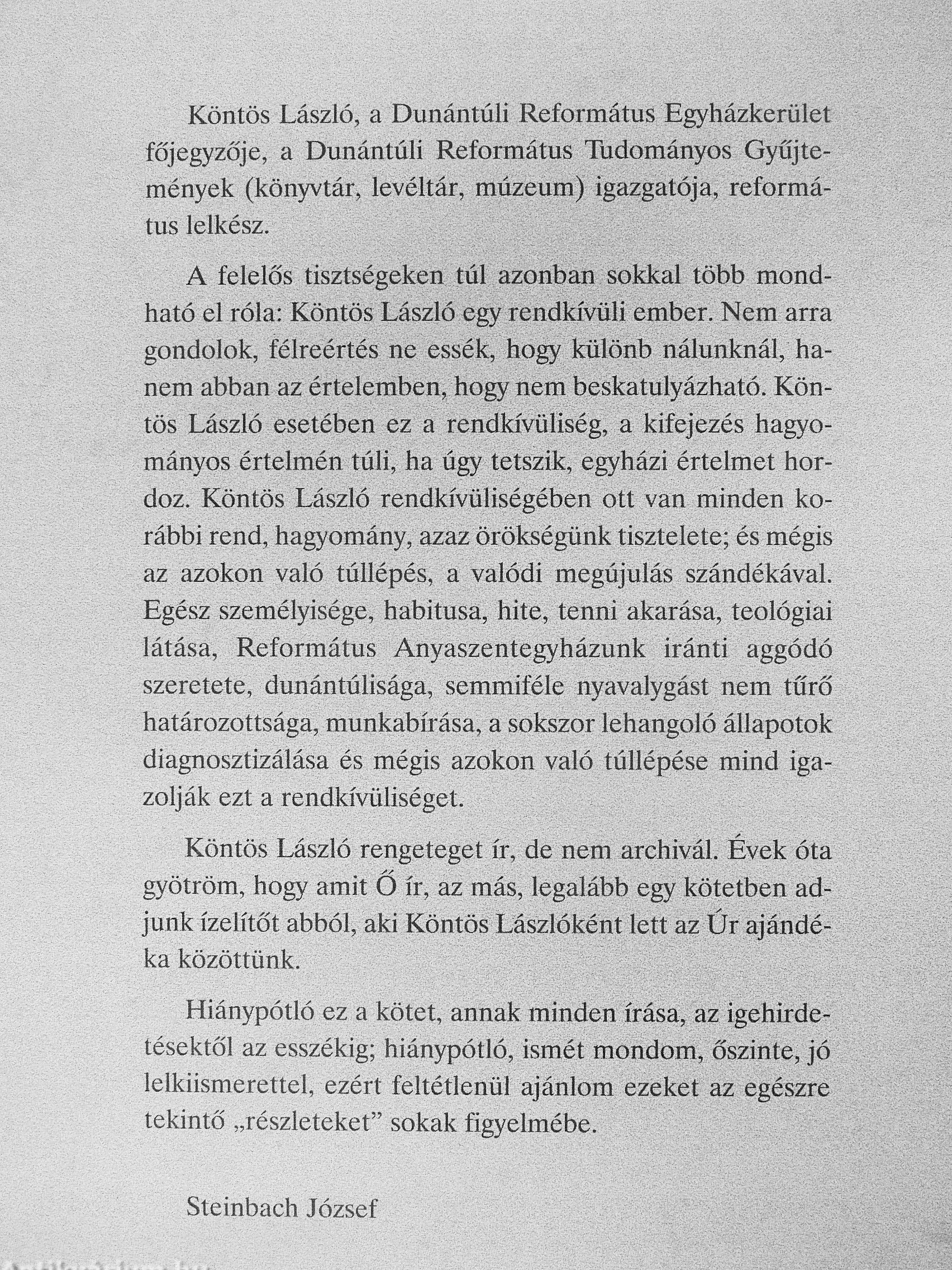 A felelős tisztségeken túl azonban sokkal több mondható el róla: Köntös László egy rendkívüli ember. Nem arra gondolok, félreértés ne essék, hogy különb nálunknál, hanem abban az értelemben, hogy nem beskatulyázható. Köntös László esetében ez a rendkívüliség, a kifejezés hagyományos értelmén túli, ha úgy tetszik, egyházi értelmet hordoz. Köntös László rendkívüliségében ott van minden korábbi rend, hagyomány, azaz örökségünk tisztelete; és mégis az azokon való túllépés, a valódi megújulás szándékával. Egész személyisége, habitusa, hite, tenni akarása, teológiai látása, Református Anyaszentegyházunk iránti aggódó szeretete, dunántúlisága, semmiféle nyavalygást nem tíirő határozottsága, munkabírása, a sokszor lehangoló állapotok diagnosztizálása és mégis azokon való túllépése mind igazolják ezt a rendkívüliséget....