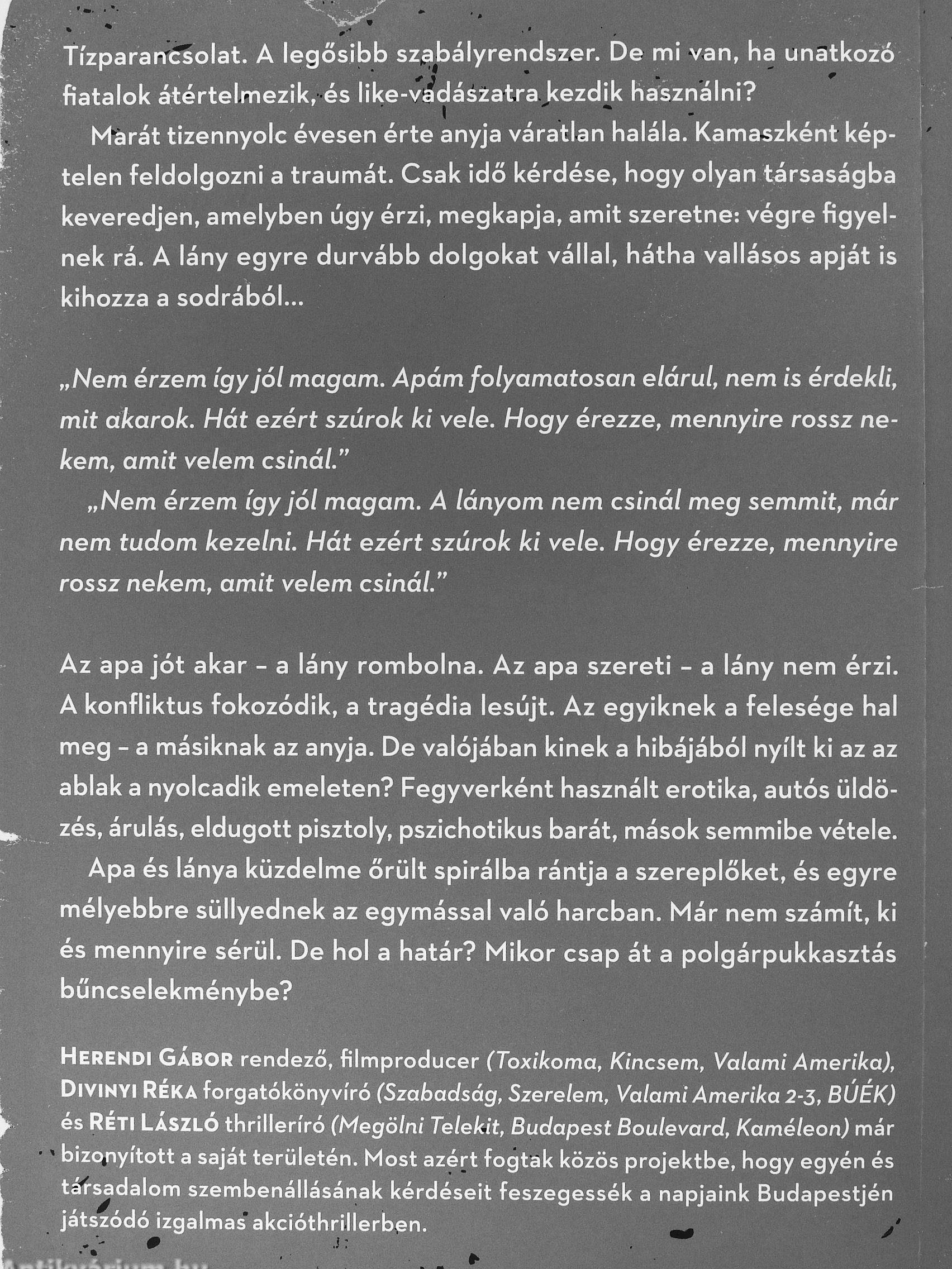 Herendi Gábor rendező, filmproducer (Toxikoma, Kincsem, Valami Amerika), Divinyi Réka forgatókönyvíró (Szabadság, Szerelem, Valami Amerika 2-3, BÚÉK) és Réti László thrllleríró (Megölni Telekit, Budapest Boulevard, Kaméleon) már «bizonyított a saját területén. Most azért fogtak közös projektbe, hogy egyén és^ társadalom szembenállásának kérdéseit feszegessék a napjaink Budapestjén játszódó_izgalma?akcióthrillerben