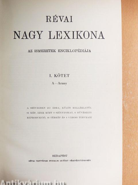 | I. kötet: A-Arany - A szövegben 213 ábra; külön mellékletül 61 kép, ezek közt 9 színnyomat, 6 művészeti reprodukció, 16 ttérkép és 4 városi tervrajz | 1-815 |