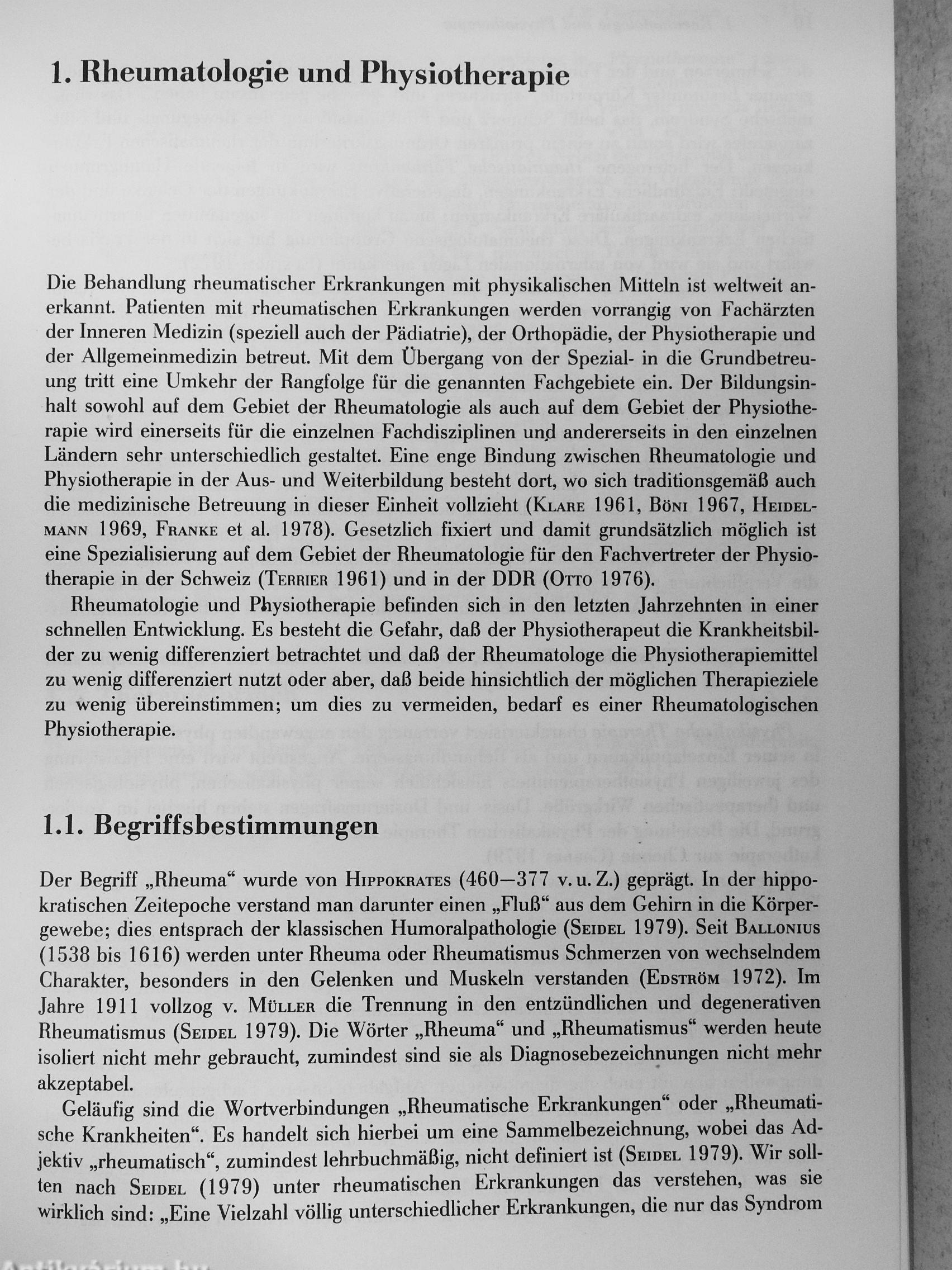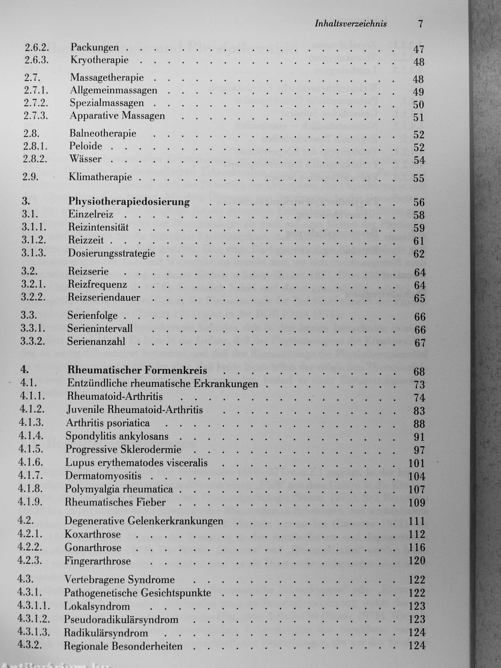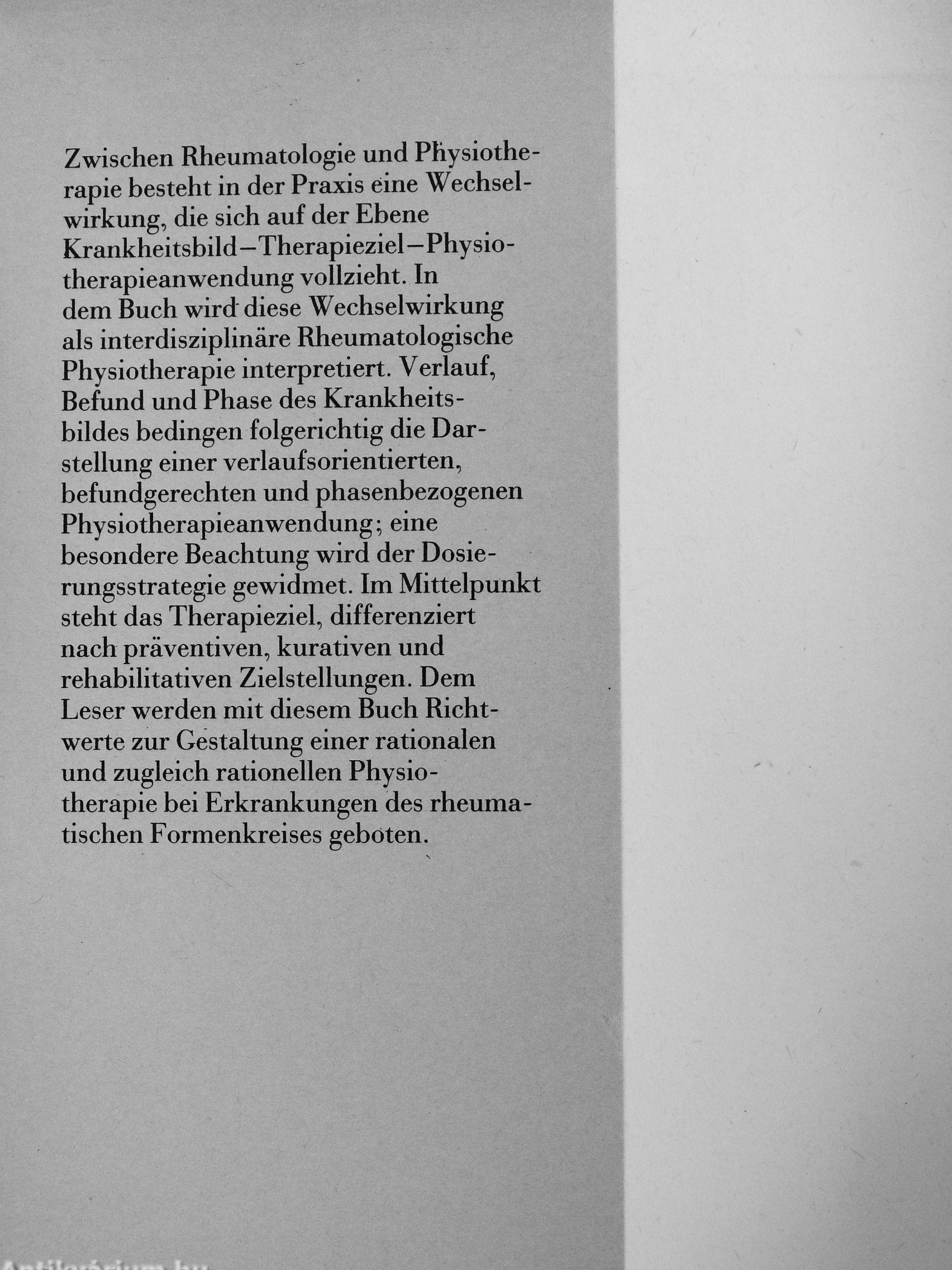 Zwischen Rheumatologie und Physiotherapie besteht in der Praxis eine Wechselwirkung, die sich auf der Ebene Krankheitsbild-Therapieziel-Physio-therapieanwendung vollzieht. In dem Buch wird diese Wechselwirkung als interdisziplinäre Rheumatologische Physiotherapie interpretiert. Verlauf, Befund und Phase des Krankheitsbildes bedingen folgerichtig die Darstellung einer verlaufsorientierten, befundgerechten und phasenbezogenen Physiotherapieanwendung; eine besondere Beachtung wird der Dosierungsstrategie gewidmet. Im Mittelpunkt steht das Therapieziel, differenziert nach präventiven, kurativen und rehabilitativen Zielstellungen. Dem Leser werden mit diesem Buch Richtwerte zur Gestaltung einer rationalen und zugleich rationellen Physiotherapie bei Erkrankungen des rheumatischen Formenkreises geböten.