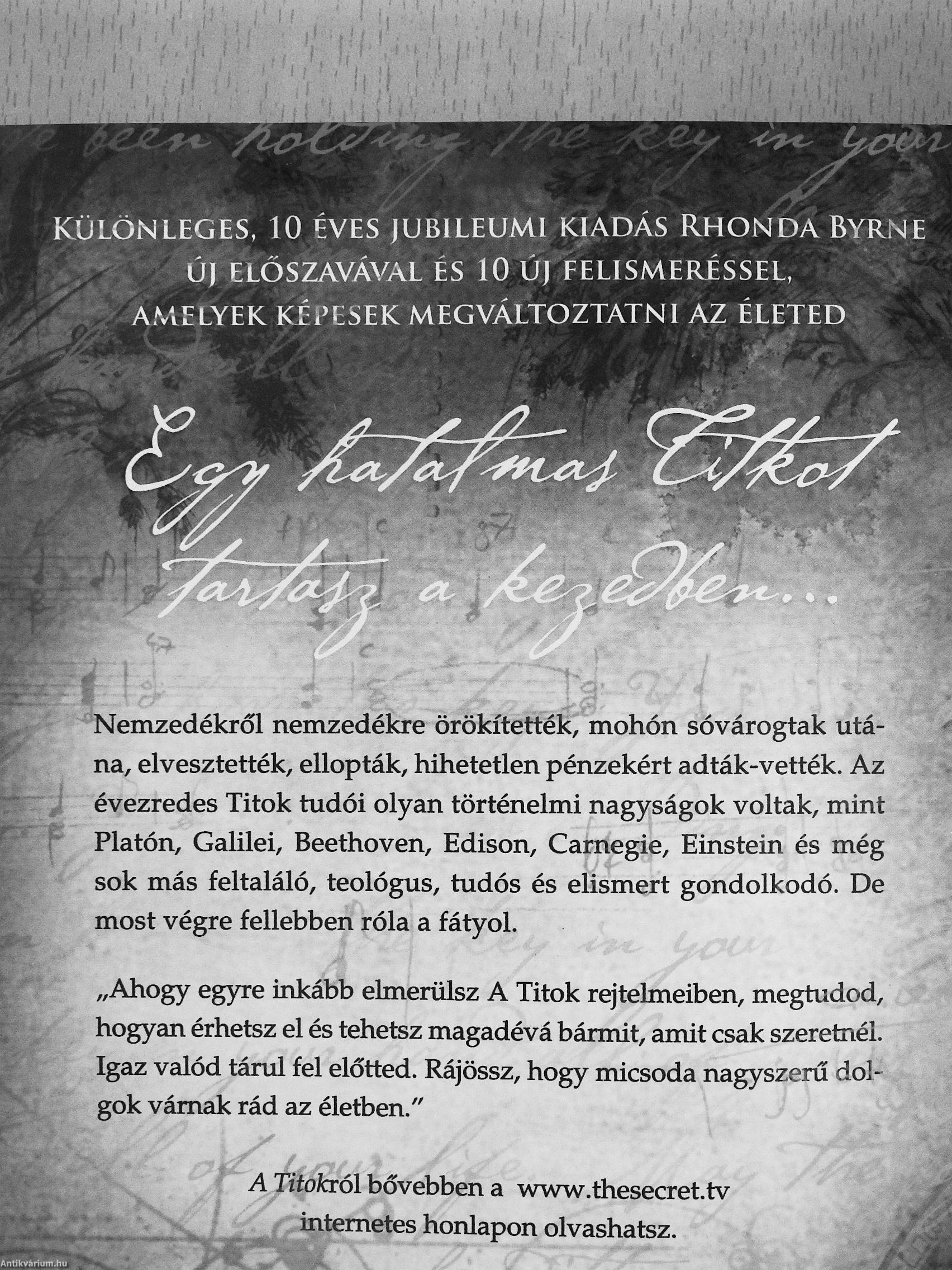 rNemzedékről nemzedékre örökítették^ mohón sóvárogtak utána, elvesztették, ellopták, hihetetlen pénzekért adták-vették. Az ^ évezredes Titok tudói olyan történelmi nagyságok voltak, mintL^ Platón, Galilei, Beethoven, Edison, Carnegie, Einstein és még * 1 sok más feltaláló, teológus, tudós és elismert gondolkodó. De ' most végre fellebben róla a fátyol.