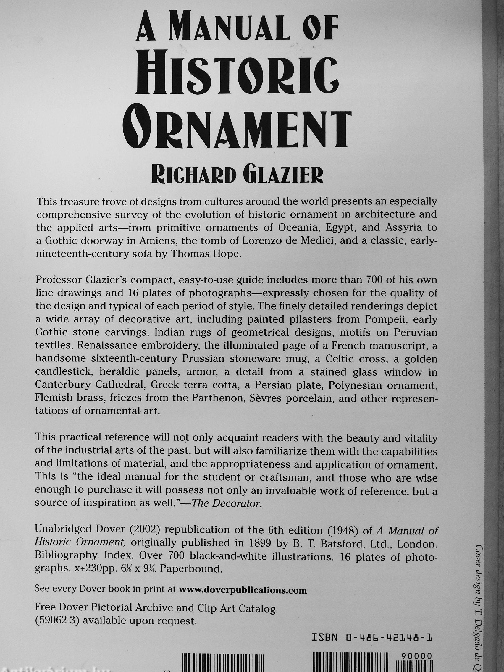 Historic Ornament, originally published in 1899 by B. T. Batsford, Ltd., London. Bibliography. Index. Over 700 black-and-white illustrations. 16 plates of photo- § j