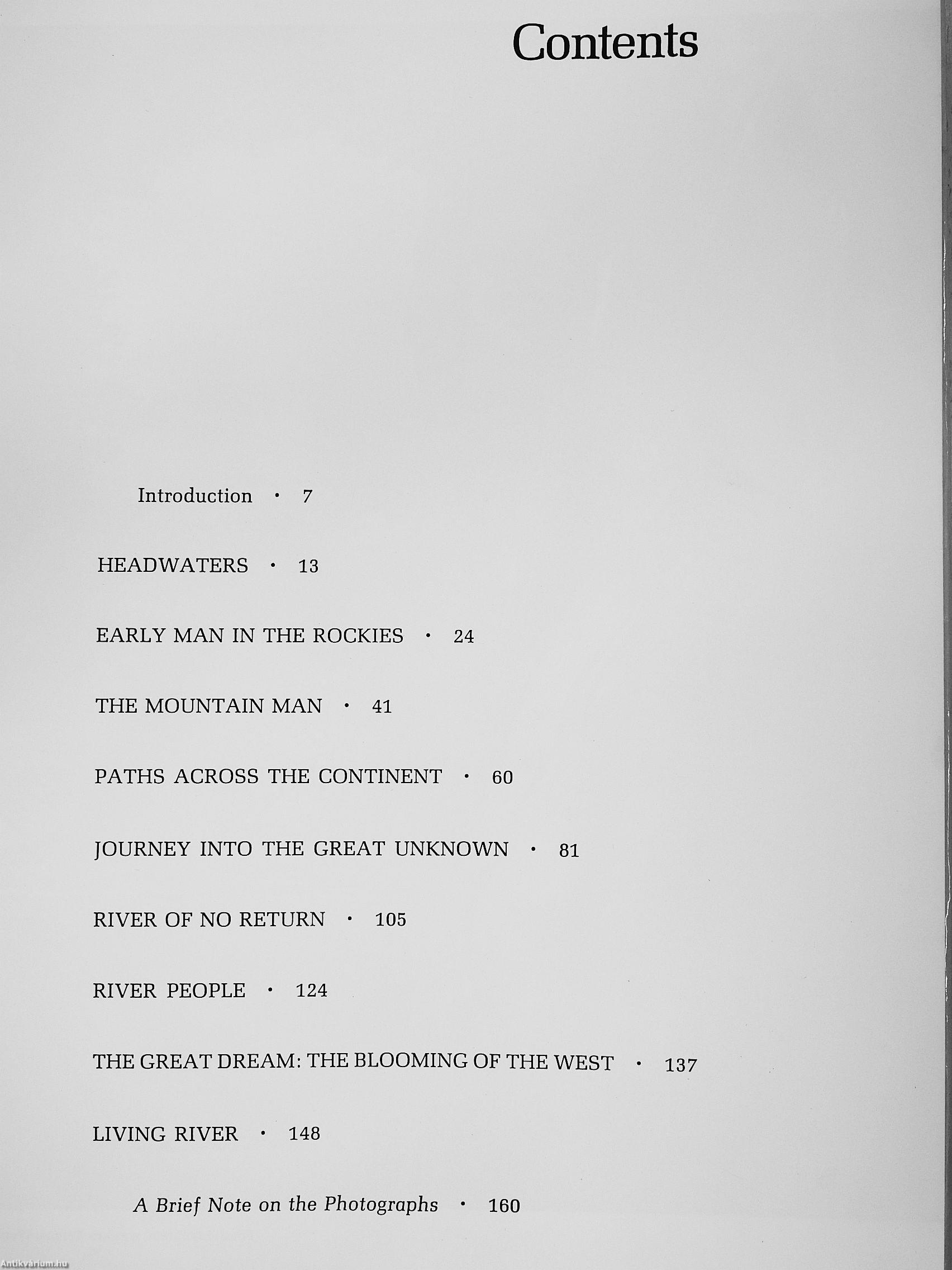 NOTHING SO DOMINATES the North American continent as the Rocky Mountains. They writhe across the land like the backbone of some giant prehistoric animal. Down from the spine of this great backbone, like ribs of the beast, come the rivers that carve and determine the heartland of the United States—the rivers of the Rockies: the Rio Grande, the Platte, the Missouri, the Snake, the Green, the Colorado . . . along with their backwaters, creeks, and tributaries.