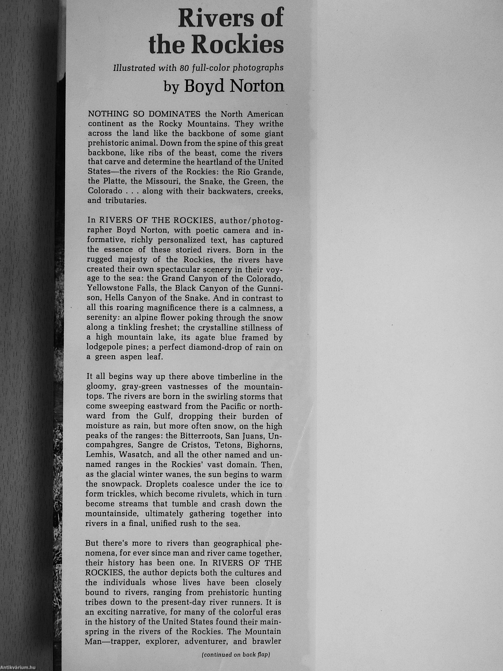 In RIVERS OF THE ROCKIES, author/photographer Boyd Norton, with poetic camera and informative, richly personalized text, has captured the essence of these storied rivers. Born in the rugged majesty of the Rockies, the rivers have created their own spectacular scenery in their voyage to the sea: the Grand Canyon of the Colorado, Yellowstone Falls, the Black Canyon of the Gunnison, Hells Canyon of the Snake. And in contrast to all this roaring magnificence there is a calmness, a serenity: an alpine flower poking through the snow along a tinkling freshet: the crystalline stillness of a high mountain lake, its agate blue framed by lodgepole pines; a perfect diamond-drop of rain on a green aspen leaf.