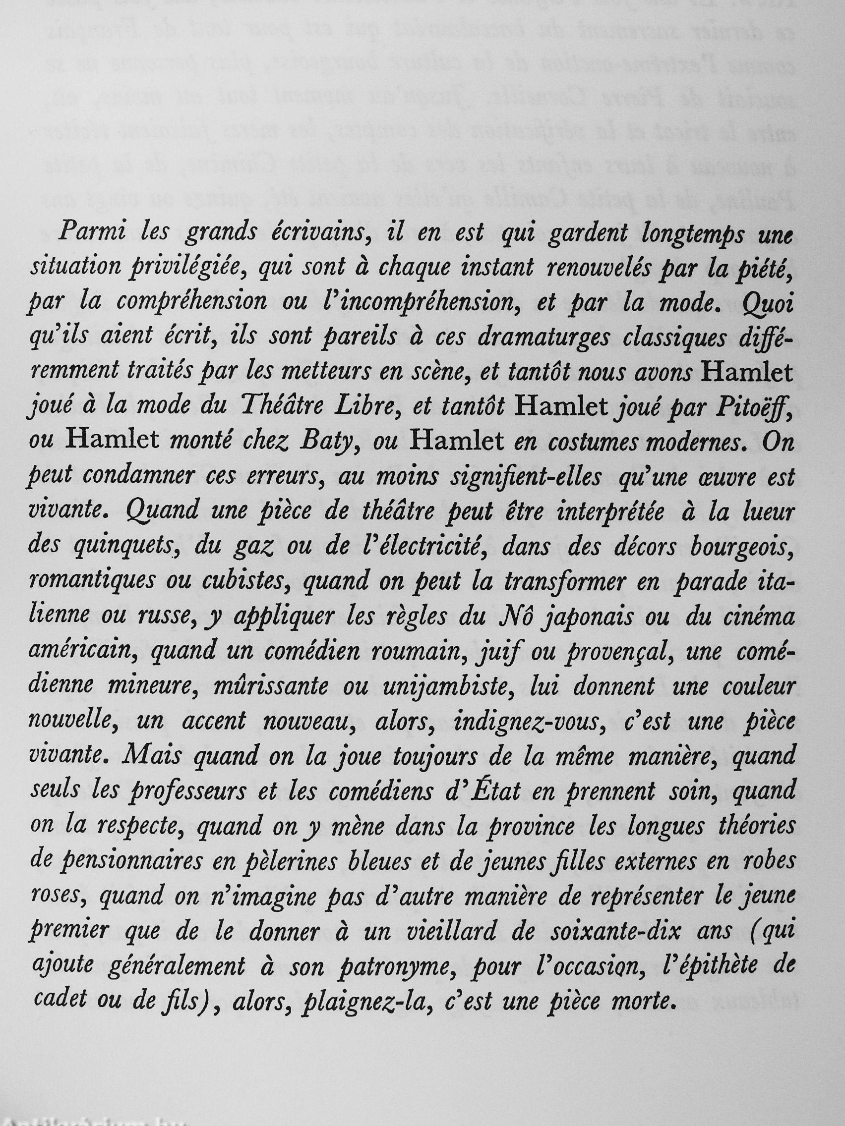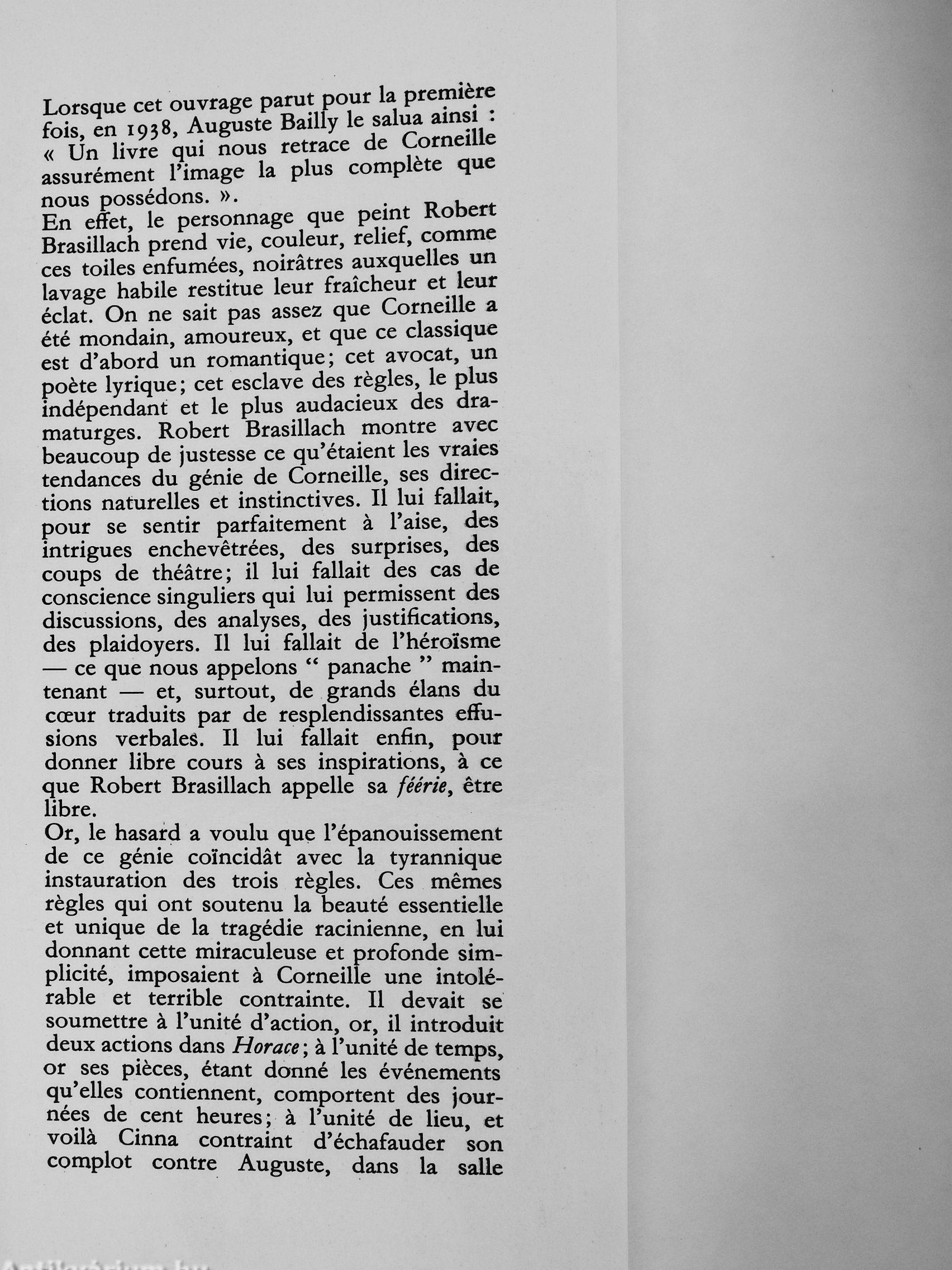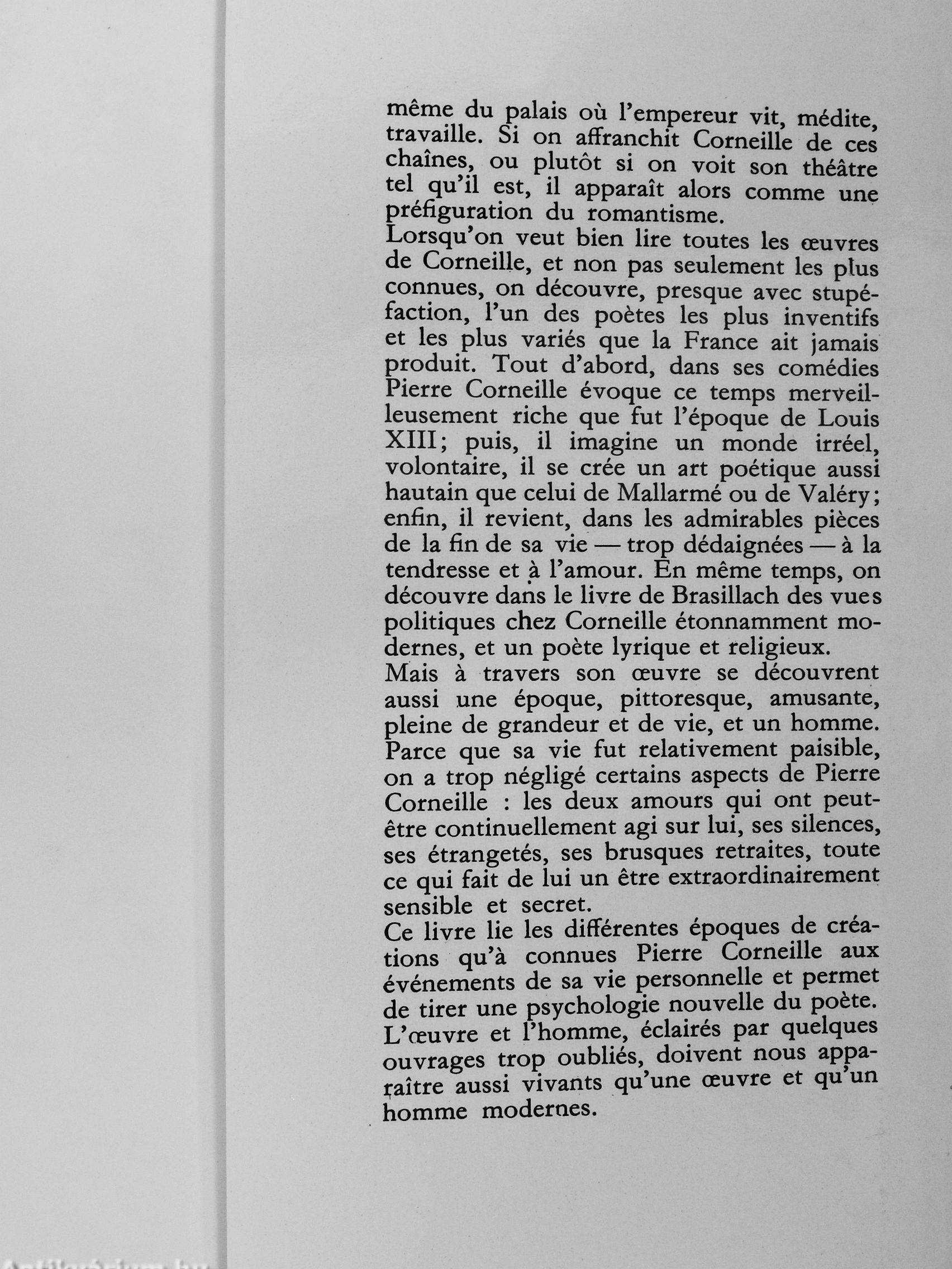 meme du palais ou l'empereur vit, médite, travaille. Si on affranchit Corneille de ces chaînes, ou plutôt si on voit son théâtre tel qu'il est, il apparaît alors comme une préfiguration du romantisme. Lorsqu'on veut bien lire toutes les ouvres de Corneille, et non pas seulement les plus connues, on découvre, presque avec stupéfaction, l'un des poetes les plus inventifs et les plus variés que la France ait jamais produit. Tout d'abord, dans ses comédies Pierre Corneille évoque ce temps merveilleusement riche que fut l'époque de Louis XIII; puis, il imagine un monde irréel, volontaire, il se crée un art poétique aussi hautain que celui de Mallarmé ou de Valéry ; enfin, il revient, dans les admirables pieces de la fin de sa vie — trop dédaignées — a la tendresse et a l'amour. En meme temps, on découvre dans le livre de Brasillach des vues politiques chez Corneille étonnamment modernes, et un poete lyrique et religieux. Mais a travers son ouvre se découvrent aussi une époque, pittoresque, amusante, pleine de grandeur et de vie, et un homme. Parce que sa vie fut relativement paisible, on a trop négligé certains aspects de Pierre Corneille : les deux amours qui ont peut-etre continuellement agi sur lui, ses silences, ses étrangetés, ses brusques retraites, toute ce qui fait de lui un etre extraordinairement sensible et secret.