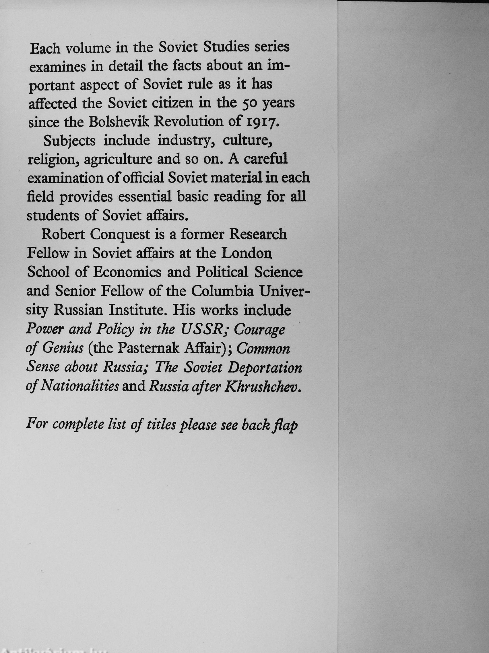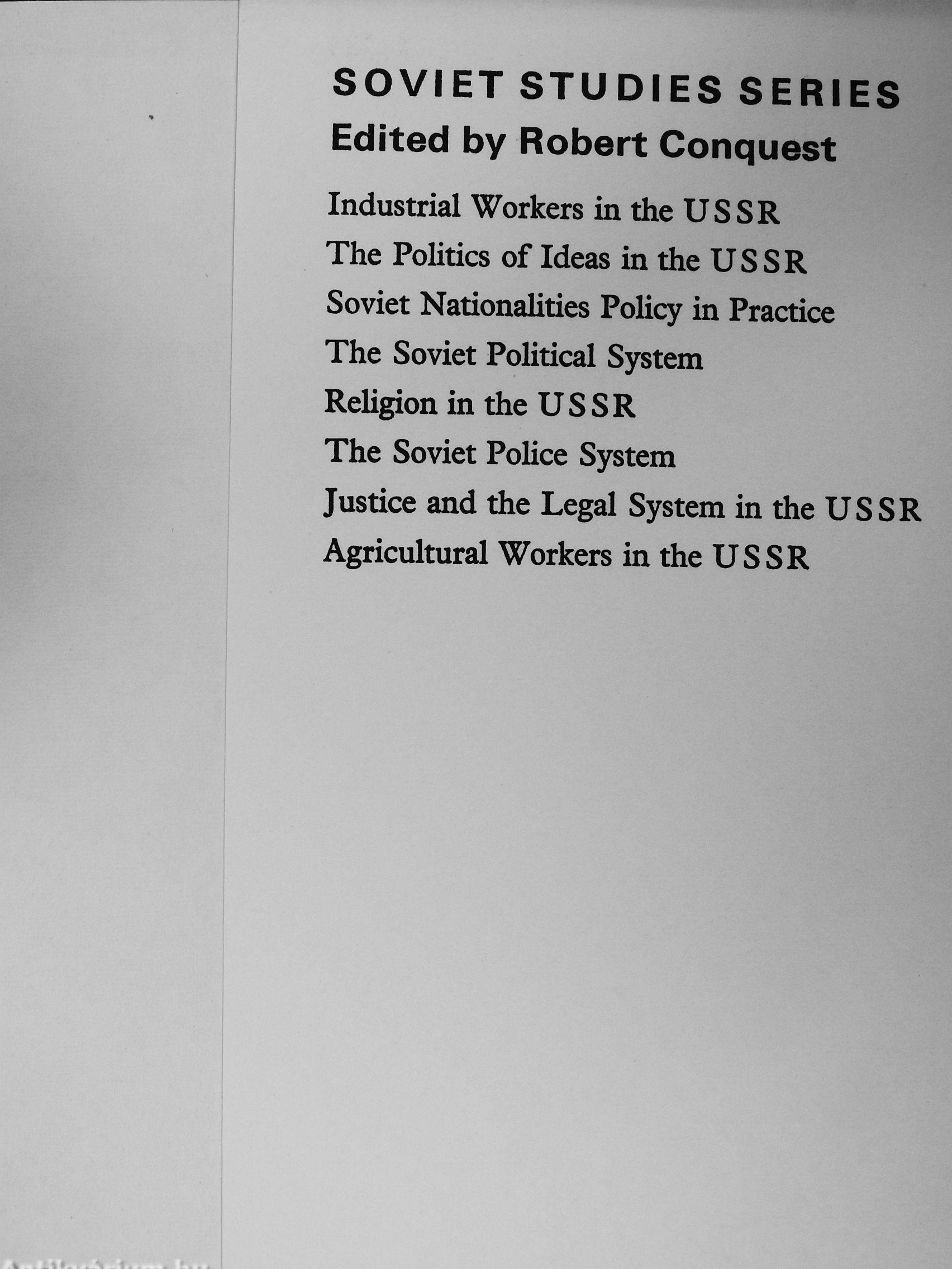 Each volume in the Soviet Studies series examines in detail the facts about an important aspect of Soviet rule as it has affected the Soviet citizen in the 50 years since the Bolshevik Revolution of 1917.