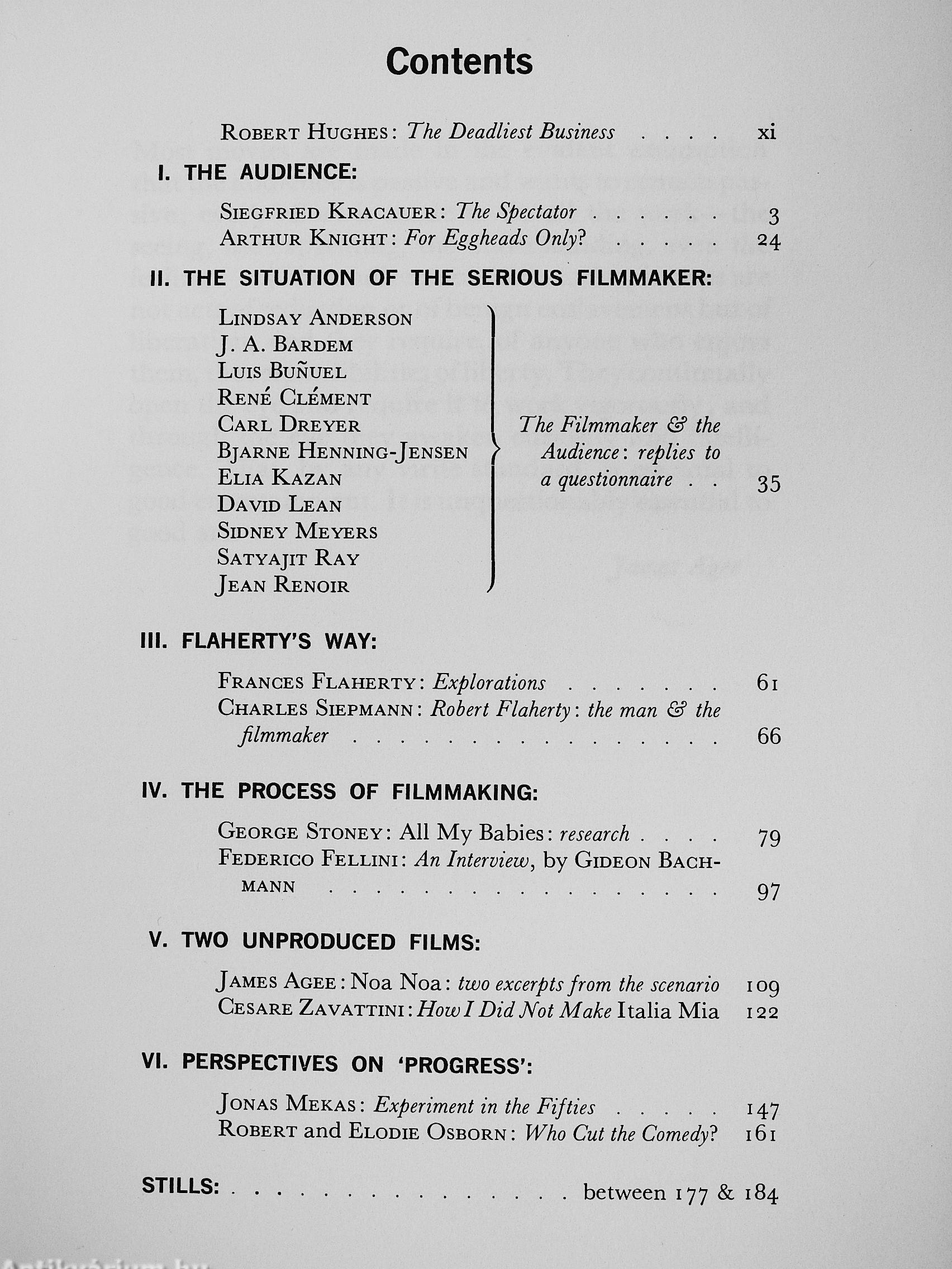 The Situation of the Serious Filmmaker: Lindsay Anderson, J. A. Bardem, Luis Bunuel, René Clément, Carl Dreyer, Björne Hen-ning-Jensen, Elia Kazan, David Lean, Sidney Meyers, Satyajit Ray, Jean Renoir Frances Flaherty: Explorations