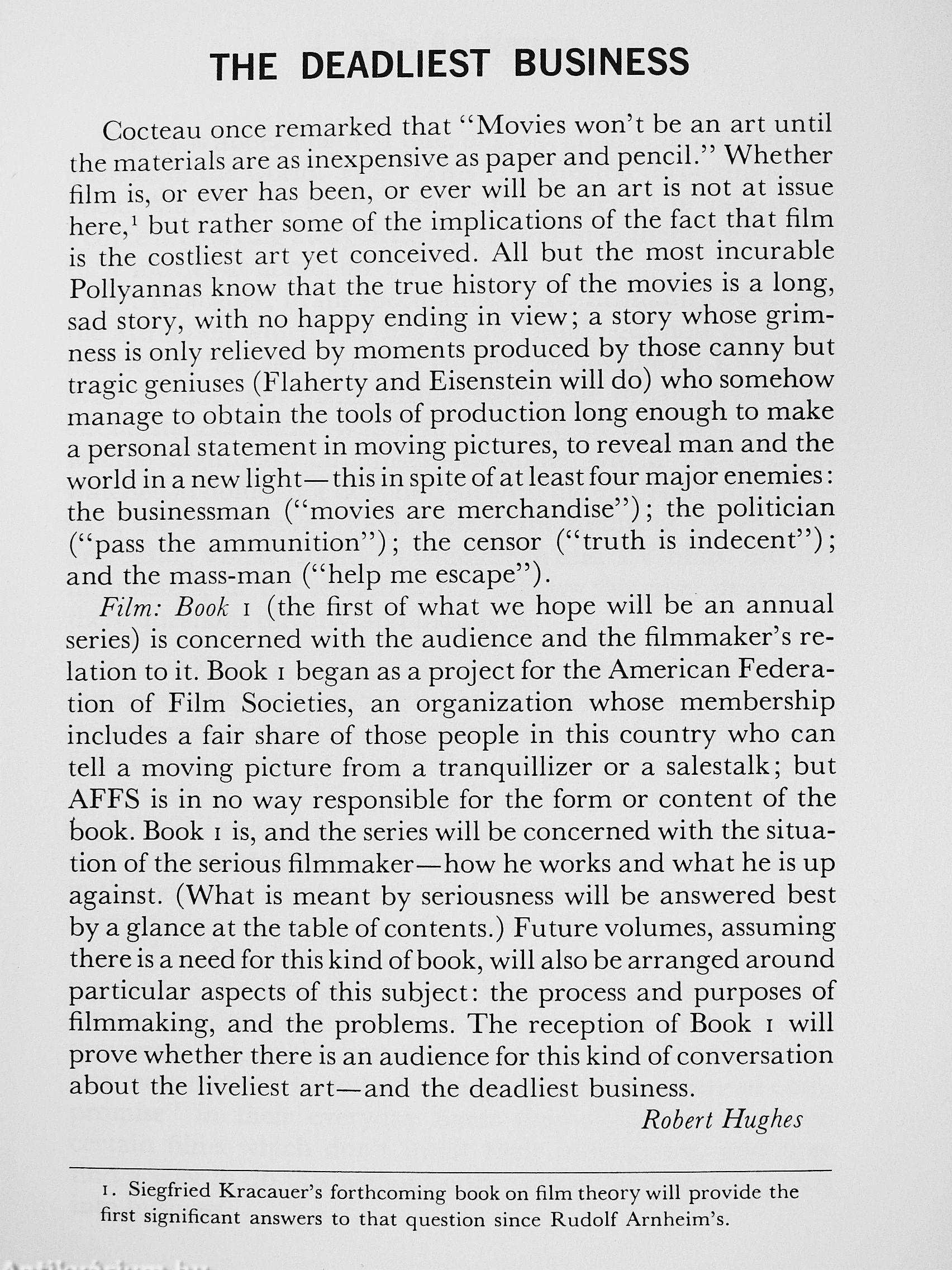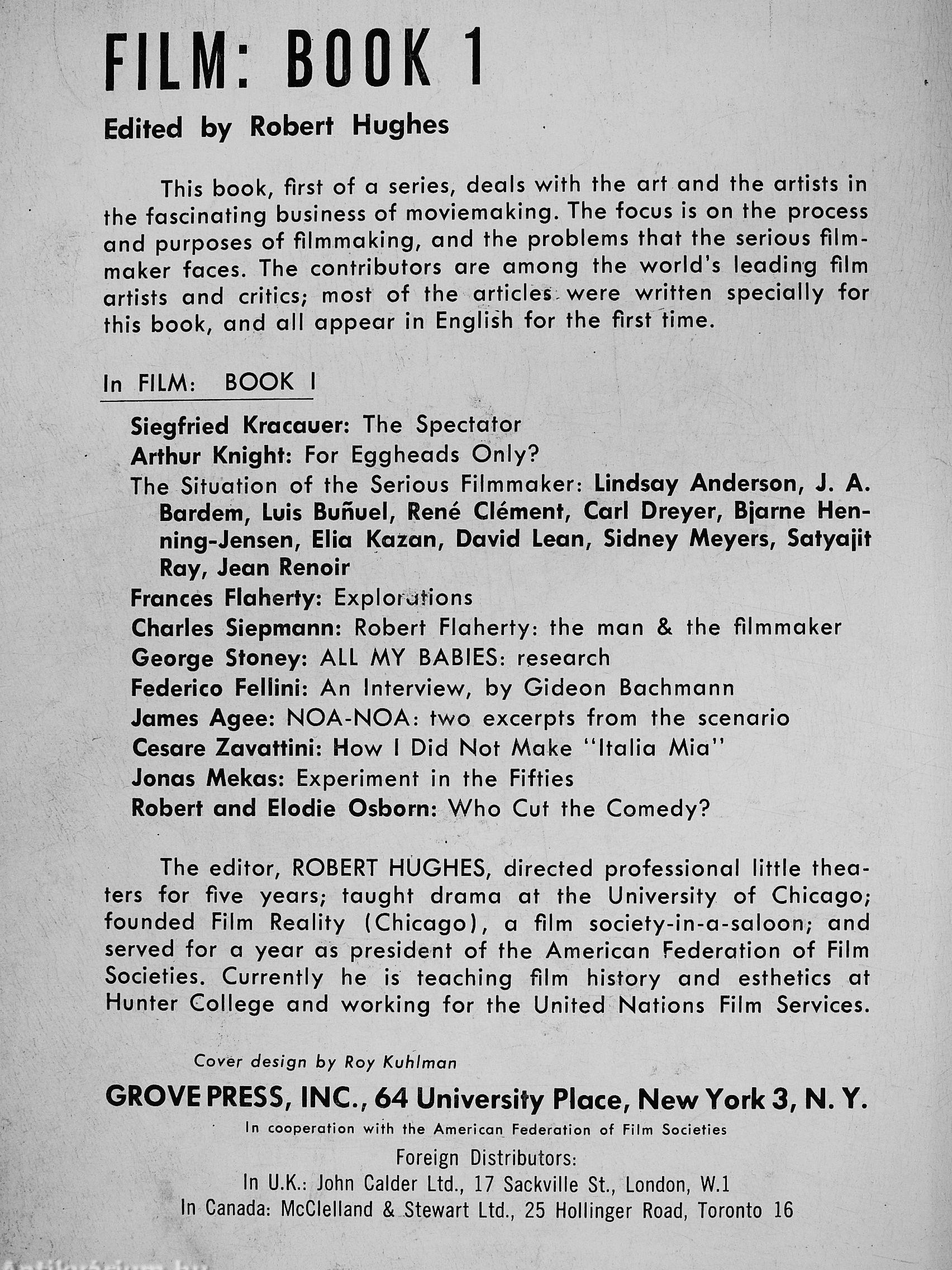 The editor, ROBERT HUGHES, directed professional little theaters for five years; taught drama at the University of Chicago; founded Film Reality (Chicago), a film society-in-a-saloon; and served for a year as president of the American Federation of Film Societies. Currently he is teaching film history and esthetics at Hunter College and working for the United Nations Film Services.