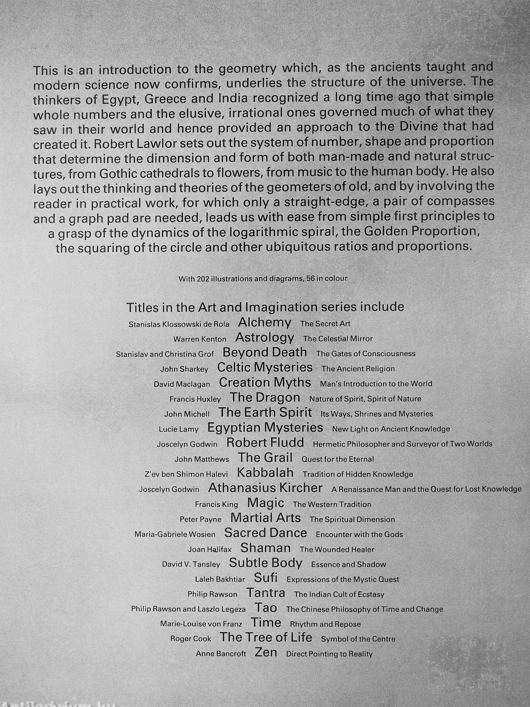 This is an introduction to the geometry which, as the ancients taught and modern science now confirms, underlies the structure of the universe. The thinkers of Egypt, Greece and India recognized a long time ago that simple whole numbers and the elusive, irrational ones governed much of what they saw in their world and hence provided an approach to the Divine that had created it. Robert Lawlor sets out the system of number, shape and proportion that determine the dimension and form of both man-made and natural structures, from Gothic cathedrals to flowers, from music to the human body. He also lays out the thinking and theories of the geometers of old, and by involving the reader in practical work, for which only a straight-edge, a pair of compasses and a graph pad are needed, leads us with ease from simple first principles to a grasp of the dynamics of the logarithmic spiral, the Golden Proportion, the squaring of the circle and other ubiquitous ratios and proportions.