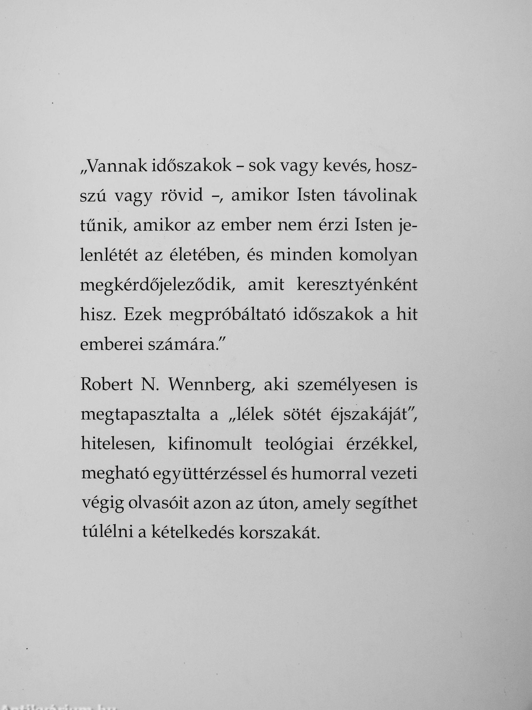 Róbert N. Wennberg, aki személyesen is megtapasztalta a „lélek sötét éjszakáját", hitelesen, kifinomult teológiai érzékkel, megható együttérzéssel és humorral vezeti végig olvasóit azon az úton, amely segíthet túlélni a kételkedés korszakát.
