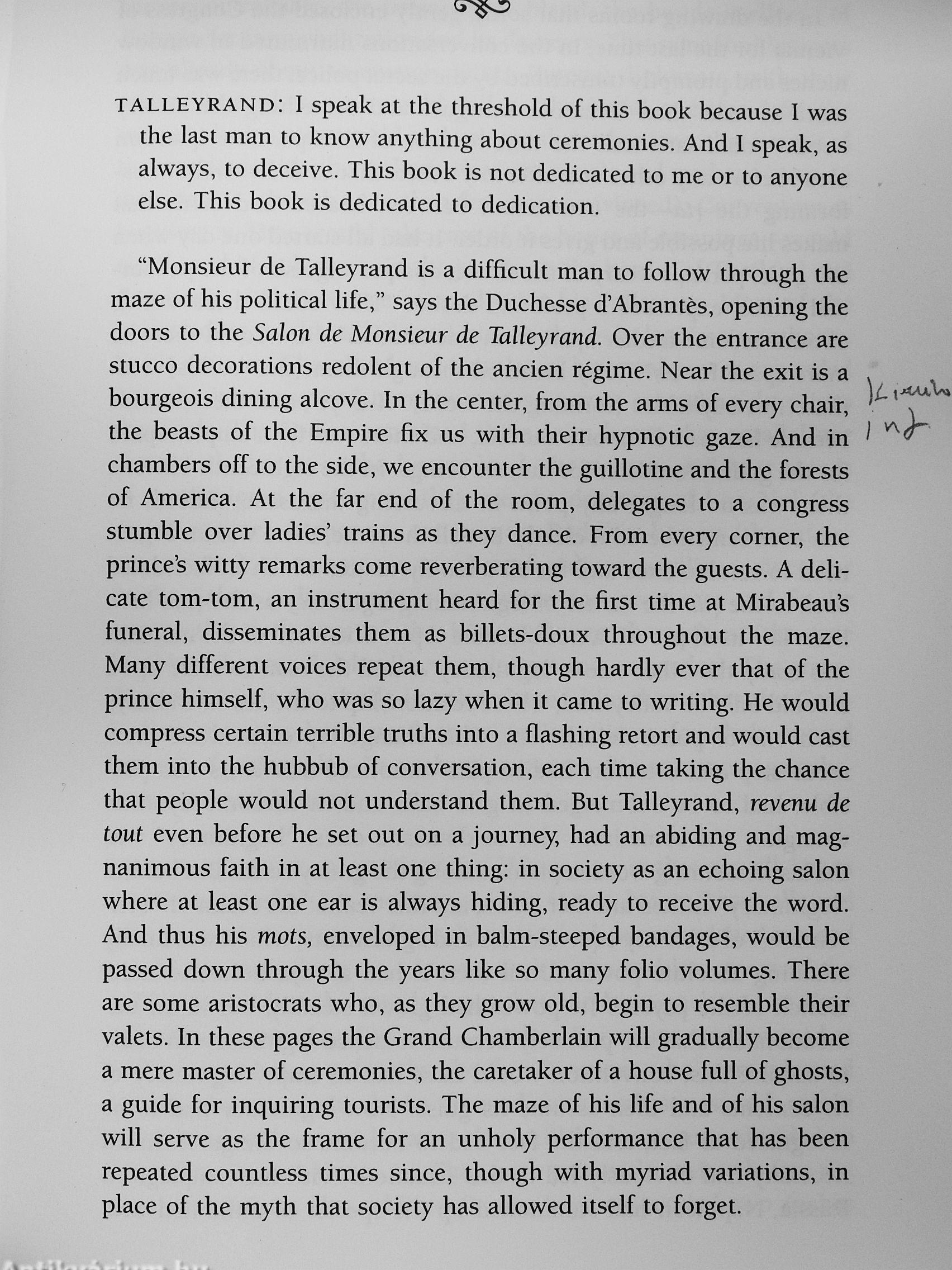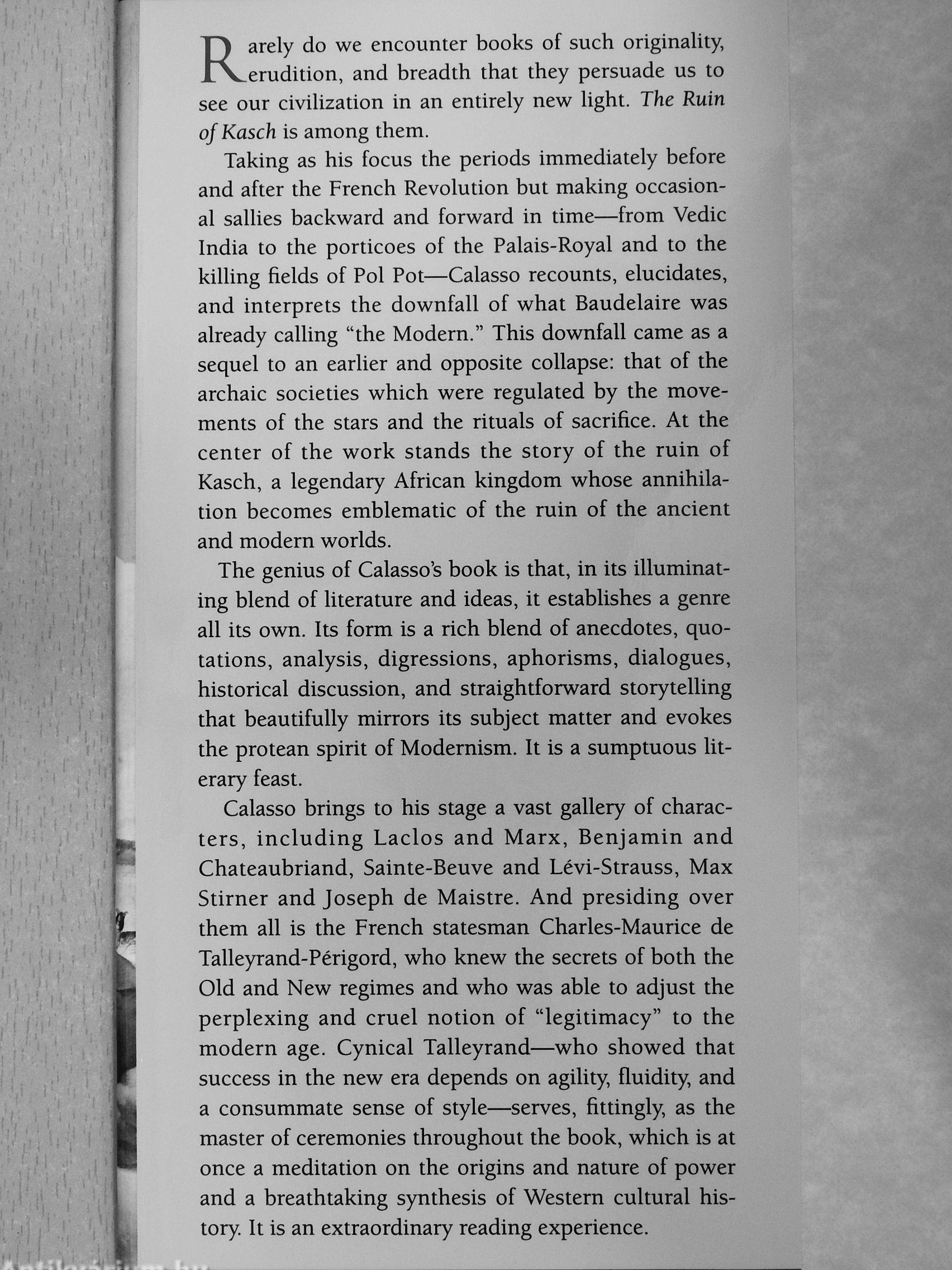 "The Ruin of Kasch takes up two subjects: the first is Talleyrand, and the second is everything else. And everything else includes all the things that have happened in human history, from the beginnings of civilization until today It is a book that loves to reveal itself as wandering and vagrant, guided only by fancy and by an insatiable curiosity, constructed of fragments, citations, digressions, anecdotes, and aphorisms— all so that it can be read with nearly continuous pleasure."