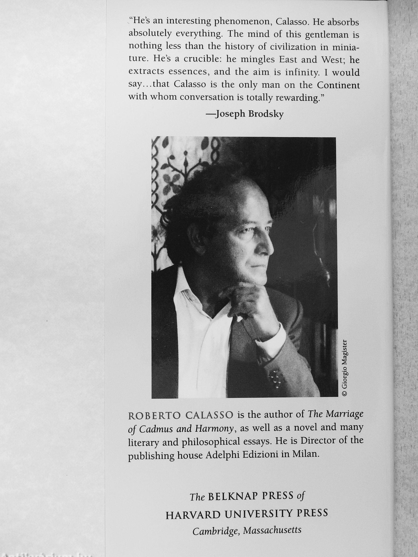 "He's an interesting phenomenon, Calasso. He absorbs absolutely everything. The mind of this gentleman is nothing less than the history of civilization in miniature. He's a crucible: he mingles East and West; he extracts essences, and the aim is infinity. 1 w^ould say that Calasso is the only man on the Continent with whom conversation is totally rewarding."