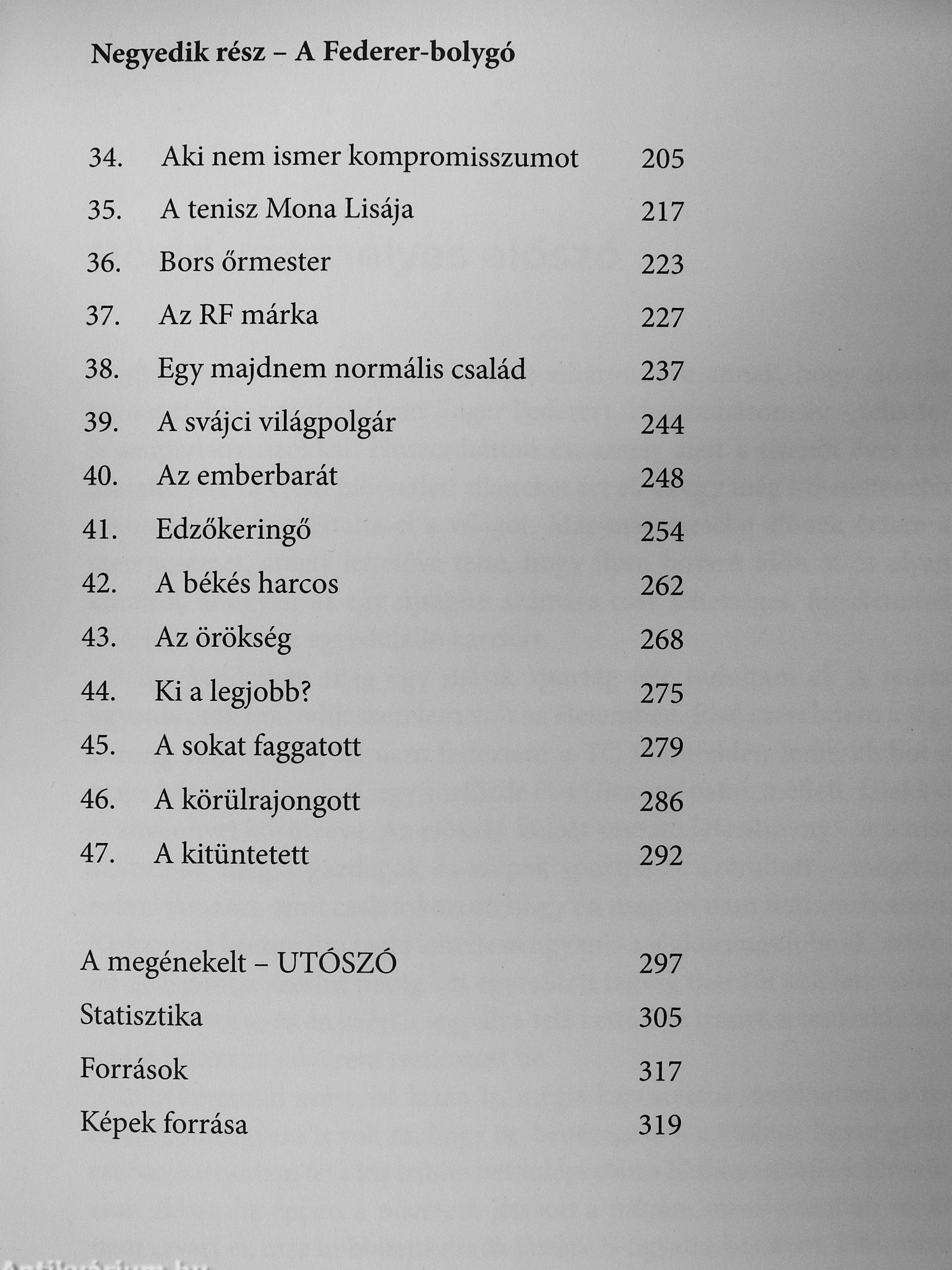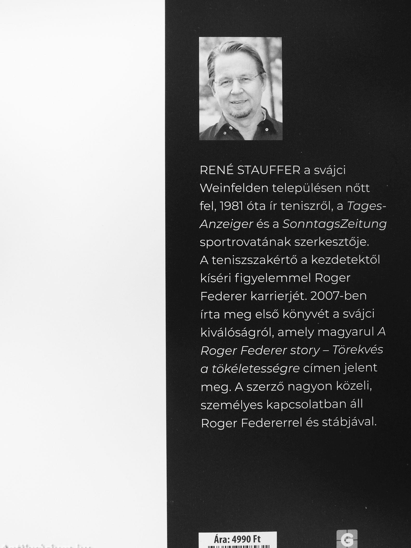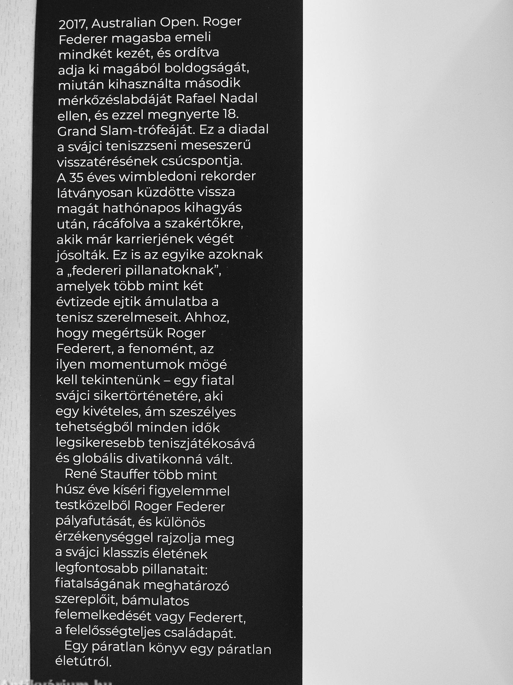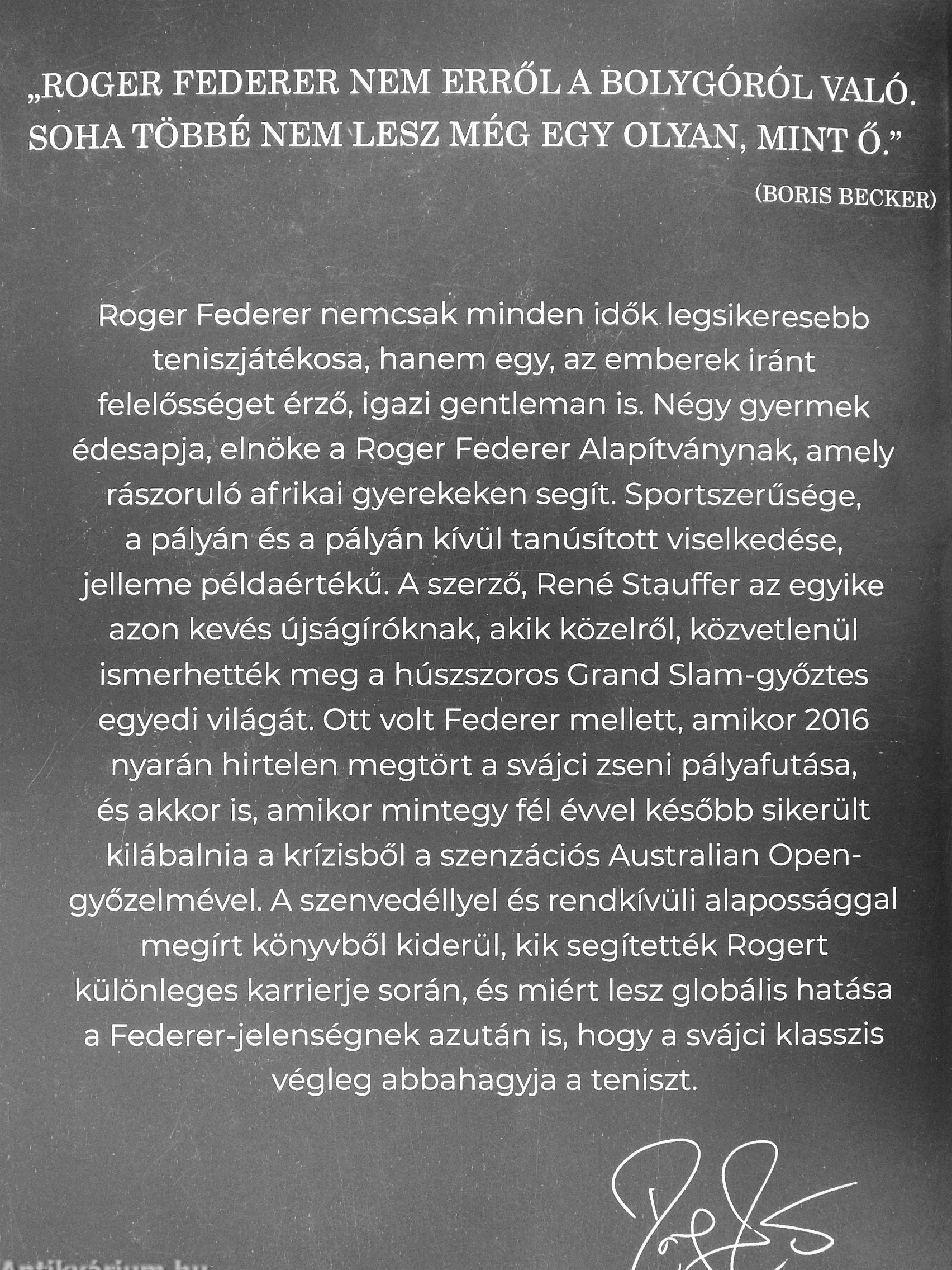 teniszjátékosa, hanem egy, az emberek iránt felelősséget érző, igazi gentleman is. Négy gyermek édesapja, elnöke a Roger Federer Alapítványnak, amely rászoruló afrikai gyerekeken segít. Sportszerűsége, a pályán és a pályán kívül tanúsított viselkedése, jelleme példaértékű. A szerző, René Stauffer az egyike azon kevés újságíróknak, akik közelről, közvetlenül ismerhették meg a húszszoros Grand Slam-győztes egyedi világát. Ott volt Federer mellett, amikor 2016 nyarán hirtelen megtört a svájci zseni pályafutása, és akkor is, amikor mintegy fél évvel később sikerült kilábalnia a krízisből a szenzációs Australian Open-győze lm ével. A szenvedéllyel és rendkívüli alapossággal