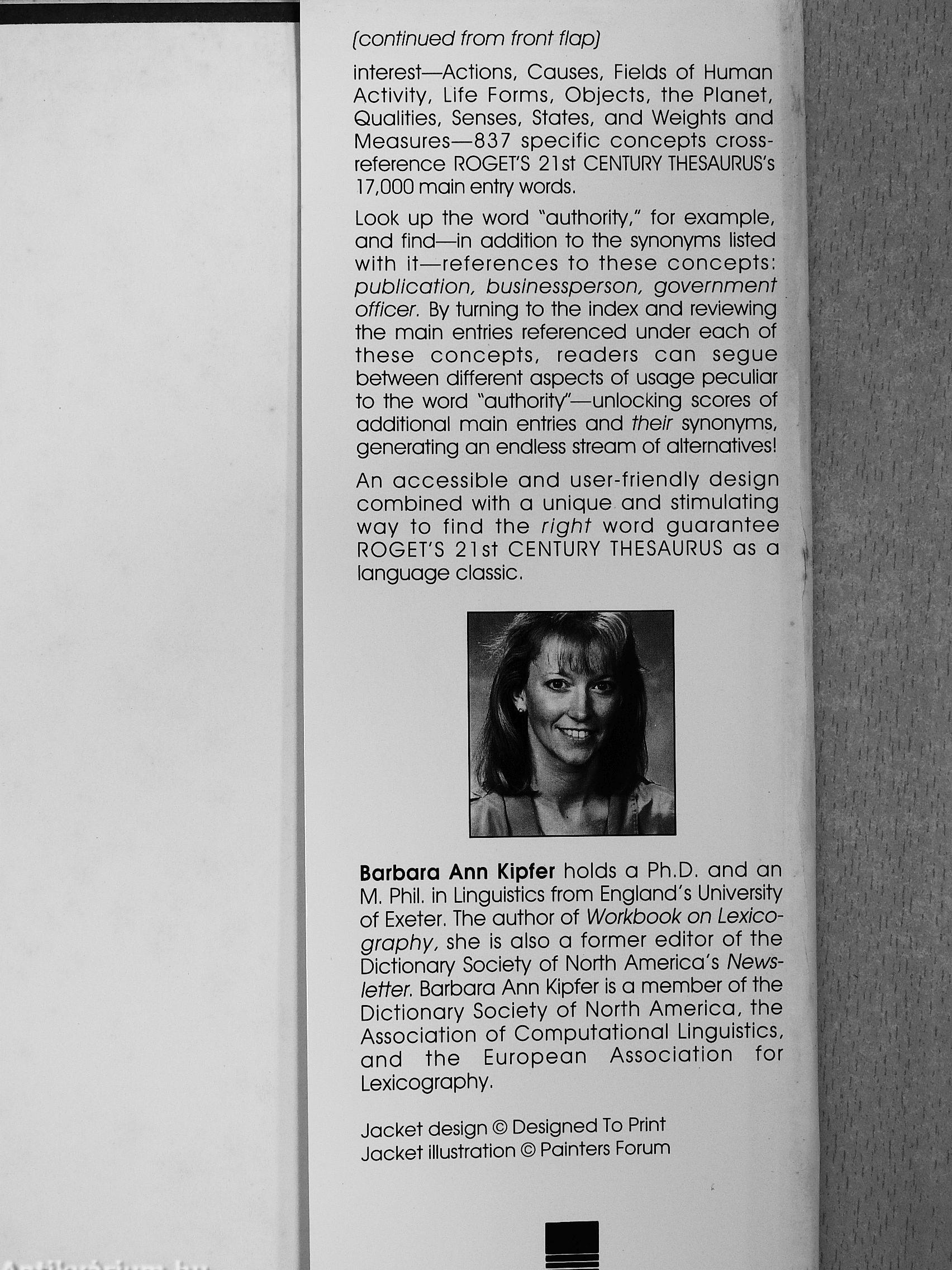 Barbara Ann Kipfer holds a Ph.D. and an M. Phil, in Linguistics from England's University of Exeter, The author of Workbook on Lexicography. she is also a former editor of the Dictionary Society of North America's Newsletter Barbara Ann Kipfer is a member of the Dictionary Society of North America, the Association of Computational Linguistics, and the European Association for Lexicography.