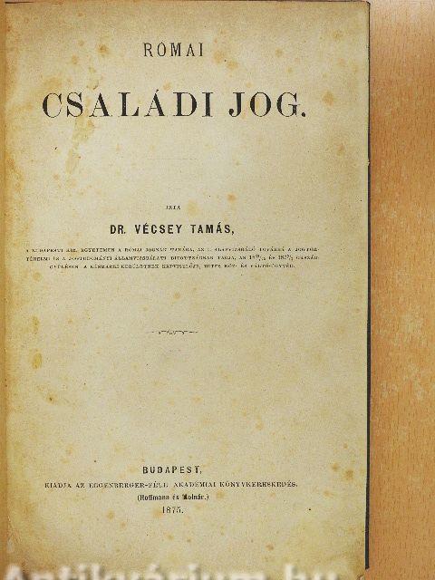 | Megjegyzés: | Irta Dr. Vécsey Tamás, a Budapesti Kir. Egyetemen a római jognak tanára, az I. alapvizsgáló tovább a jogtörténelmi és a jogtudományi államvizsgálati bizottságnak tagja, az 1869/72 és 1872/73 országgyülésen a késmárki kerületnek képviselője, hites köz- és váltó-ügyvéd. Nyomatott az Athenaeum nyomdájában. |