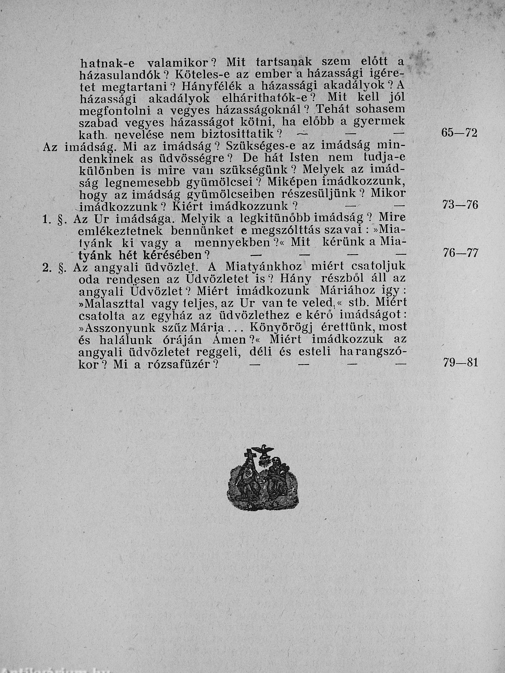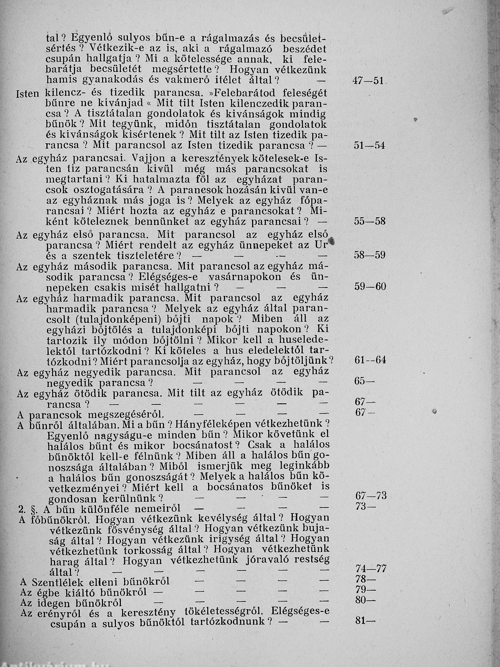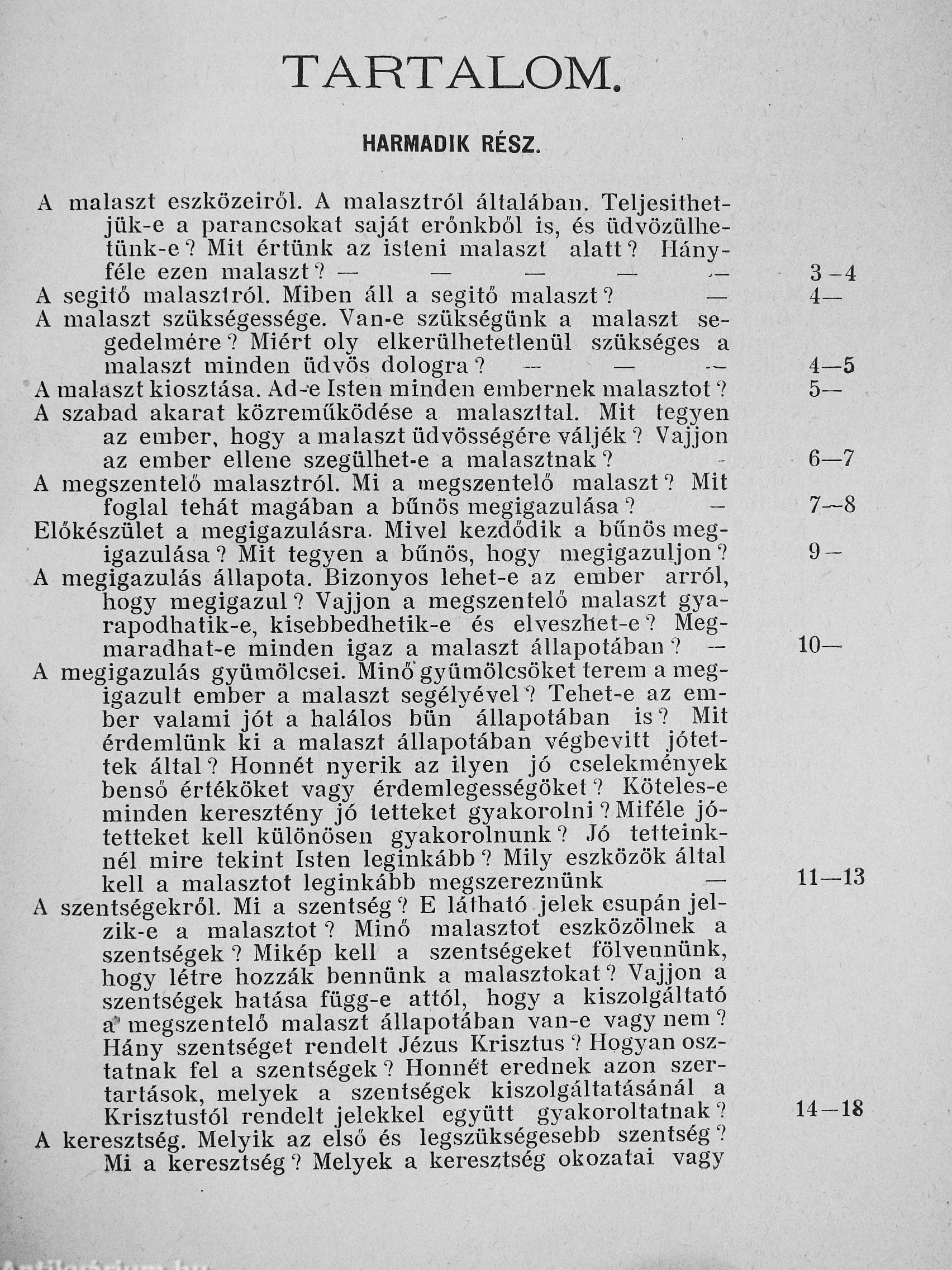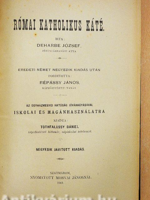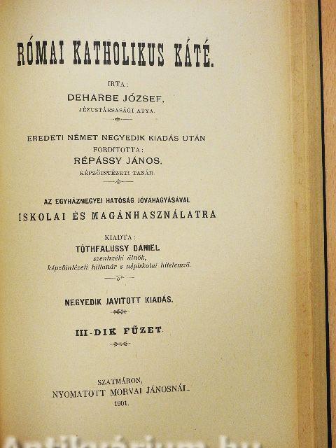 | Megjegyzés: | Három kötet egy könyvbe kötve. Negyedik javitott kiadás. Irta: Deharbe József, Jézustársasági atya. Eredeti német negyedik kiadás után forditotta: Répássy János, képzőintézeti tanár. Nyomatott Morvai Jánosnál, Szatmáron. |