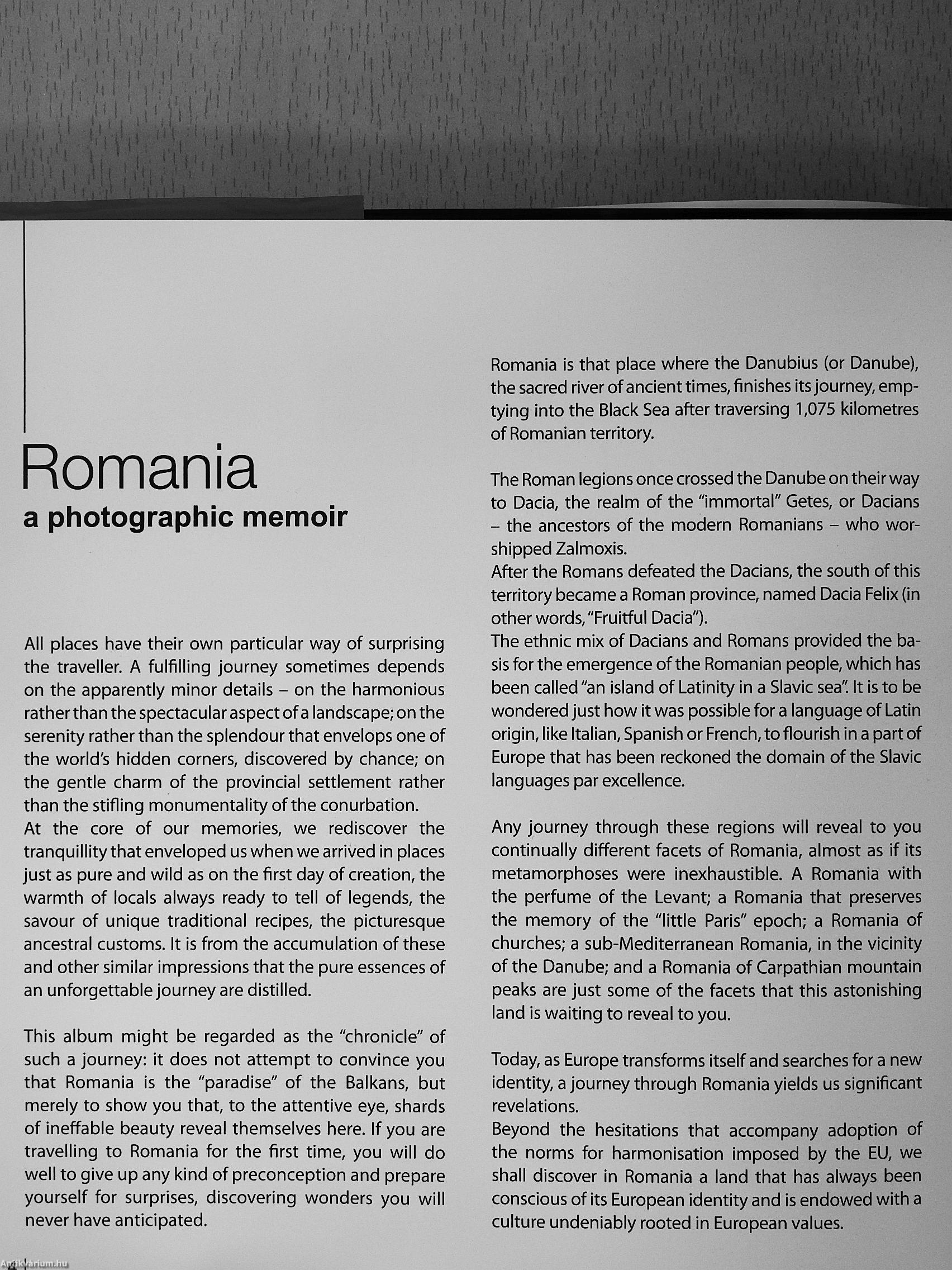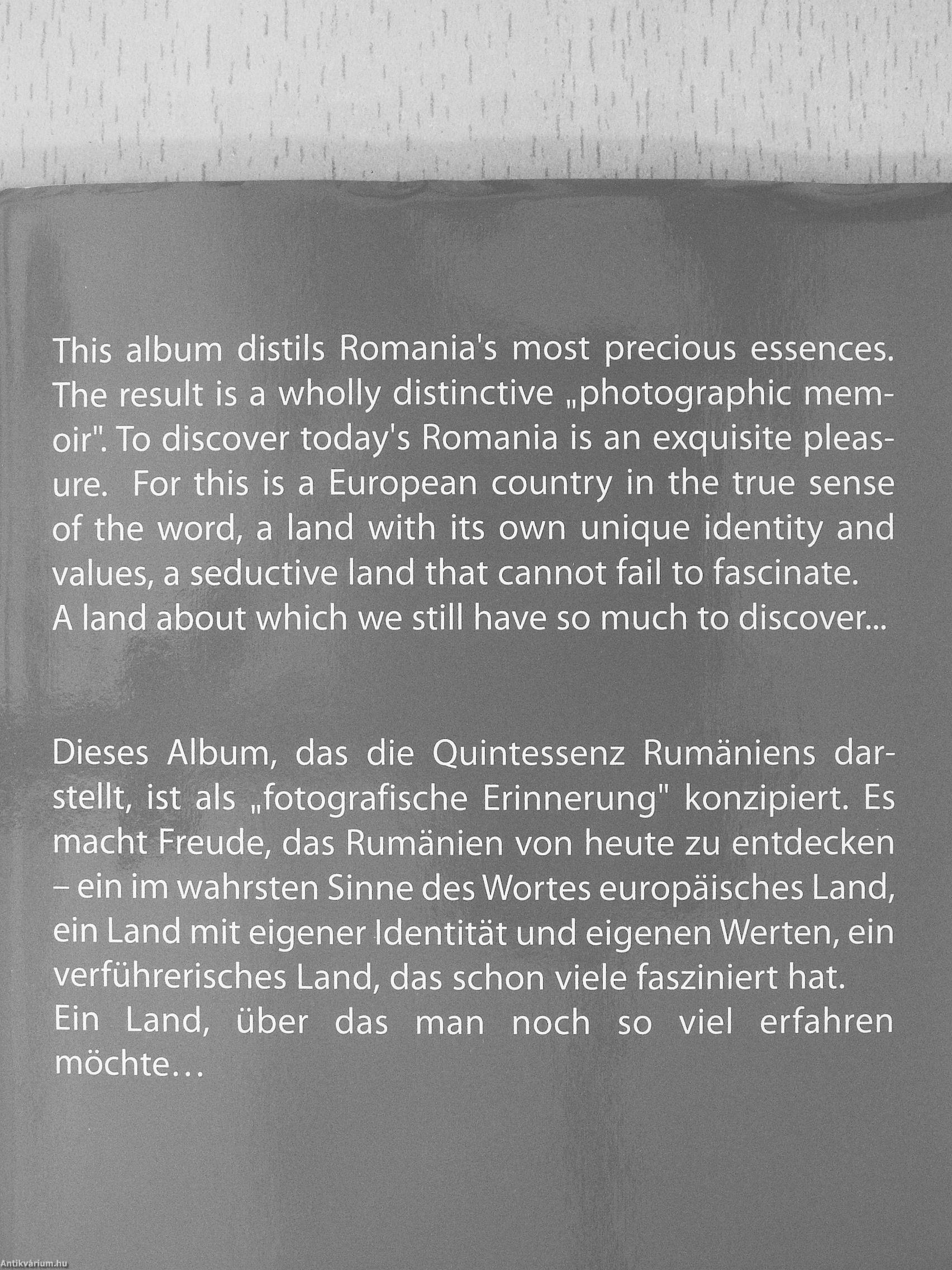 Dieses Album, das die Quintessenz Rumäniens darstellt, ist als „fotografische Erinnerung" konzipiert. Es macht Freude, das Rumänien von heute zu entdecken - ein im wahrsten Sinne des Wortes europäisches Land, ein Land mit eigener Identität und eigenen Werten, ein verführerisches Land, das schon viele fasziniert hat. Ein Land, über das man noch so viel erfahren möchte