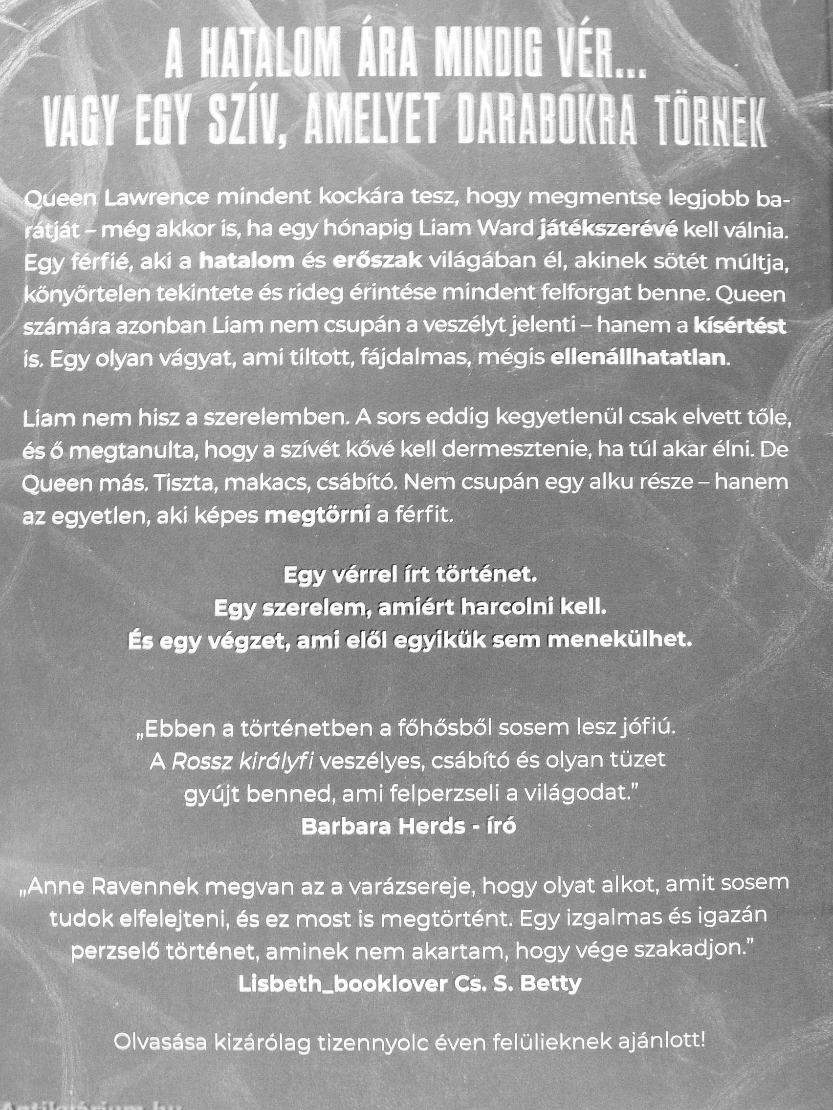 ^púeen Lawrence mindent kockára tesz, hogy megmentse legjobb barátját - még akkor is, ha egy hónapig Liam Ward játékszerévé kell válnia. Egy férfié, aki a hatalom és erőszak világában él, akinek sötét múltja, könyörtelen tekintete és rideg érintése mindent felforgat benne. Queen számára azonban Liam nem csupán a veszélyt jelenti - hanem a kísértést" ís. Egy olyan vágyat, ami tiltott, fájdalmas, mégis ellenállhatatlan.