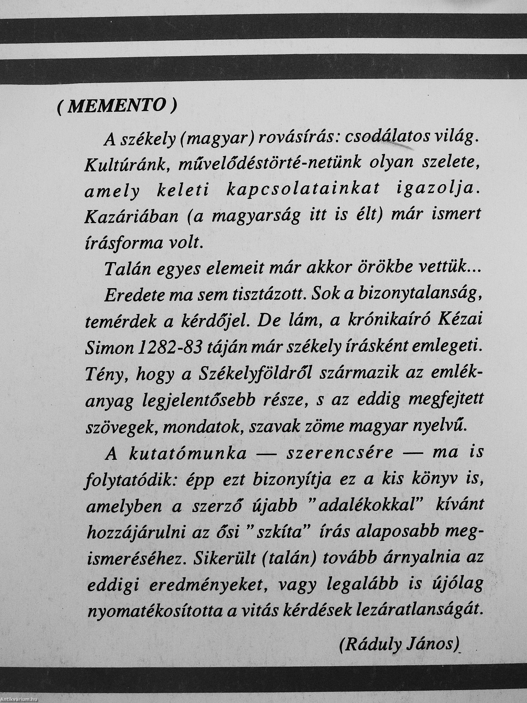 A kutatómunka — szerencsére — ma is folytatódik: épp ezt bizonyítja ez a kis könyv is^ amelyben a szerző újabb "adalékokkal" kívánt hozzájárulni az ősi "szkíta" írás alaposabb megismeréséhez. Sikerült (talán) tovább árnyalnia az eddigi eredményeket, vagy legalább is újólag nyomatékosította a vitás kérdések lezáratlanságát.