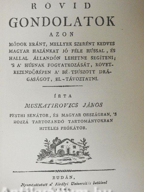 Minden jó Hazafinak kötelessége hozza magával, hogy a' mennyiben a' köz jóban szolgálhát, azt el-ne mulassa. Ezen kötelességemnek hogy meg-felelhessek, gondolataimat, mellyek által tsekély vélekedésem szerént az Hús, és Hal dolgában állandón lehetne magunkat segíteni, és a' bé-tsúszott drágaságot el-távoztatni, magamban el-végeztem, nyomtatás által, másokkal-is közleni, 's egyszer 's mind felgerjeszteni; hogy ha ne talántán valakik jobb szereket tudnának, köz-jóért elöl adják: kivánván, hogy olly jó szível fel-vétetödjenek, a' minémüvel én írtam. Ezek pedig következendőkben állanak. Vissza