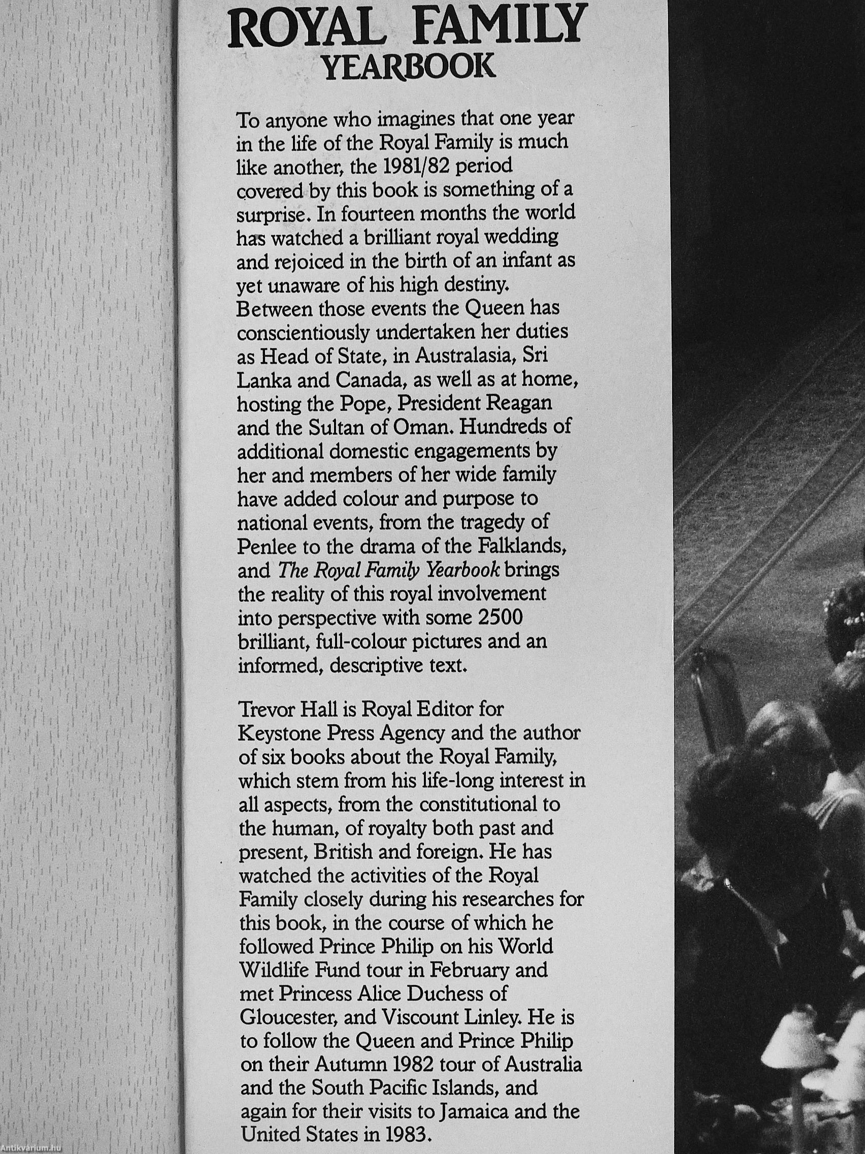 Trevor Hall is Royal Editor for Keystone Press Agency and the author of six books about the Royal Family, which stem from his life-long interest in all aspects, from the constitutional to the human, of royalty both past and present, British and foreign. He has watched the activities of the Royal Family closely during his researches for this book, in the course of which he followed Prince Philip on his World Wildlife Fund tour in February and met Princess Alice Duchess of Gloucester, and Viscount Linley. He is to follow the Queen and Prince Philip on their Autumn 1982 tour of Australia and the South Pacific Islands, and again for their visits to Jamaica and the United States in 1983. Vissza