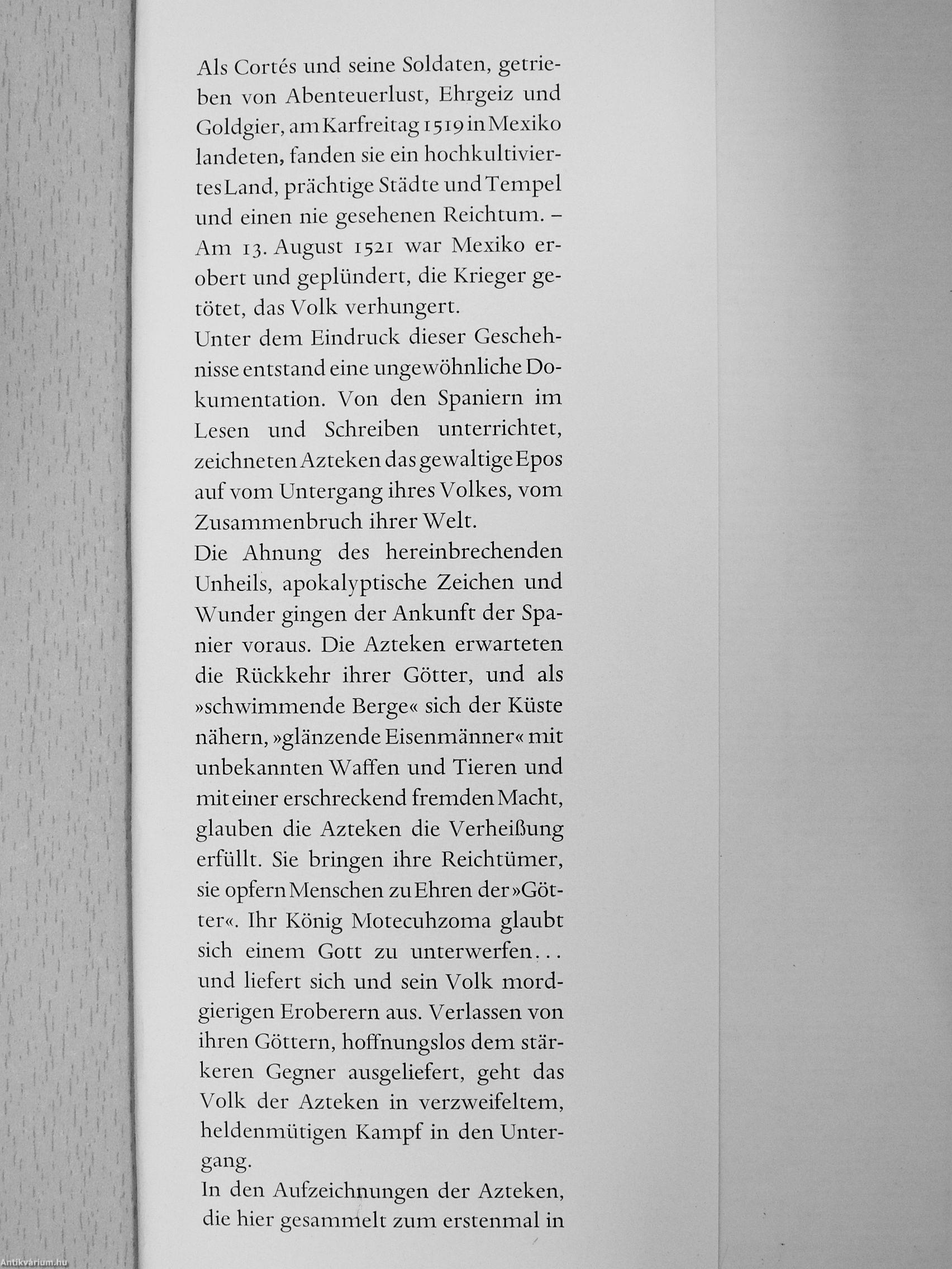 Als Cortés und seine Soldaten, getrieben von Abenteuerlust, Ehrgeiz und Goldgier, amKarfreitag i5i9ÍnMexiko landeten, fanden sie ein hochkultivier-tesLand, prächtige Städte und Tempel und einen nie gesehenen Reichtum. -Atii 13. August 1521 war Mexiko erobert und geplündert, die Krieger getötet, das Volk verhungert. Unter dem Eindruck dieser Geschehnisse entstand eine ungewöhnliche Dokumentation. Von den Spaniern im Lesen und Schreiben unterrichtet, zeichne ten Azteken das gewaltige Epos auf vom Untergang ihres Volkes, vom Zusammenbruch ihrer Welt. Die Ahnung des hereinbrechenden Unheils, apokalyptische Zeichen und Wunder gingen der Ankunft der Spanier voraus. Die Azteken erwarteten die Rückkehr ihrer Götter, und als »schwimmende Berge« sich der Küste nähern, »glänzende Eisenmänner« mit unbekannten Waffen und Tieren und mit einer erschreckend fremden Macht, glauben die Azteken die Verheißung erfüllt. Sie bringen ihre Reichtümer, sie opfern Menschen zu Ehren der »Götter«. Ihr König Motecuhzoma glaubt sich einem Gott zu unterwerfen und liefert sich und sein Volk mordgierigen Eroberern aus. Verlassen von ihren Göttern, hoffnungslos dem stärkeren Gegner ausgeliefert, geht das Volk der Azteken in verzweifeltem, heldenmütigen Kampf in den Unterging.