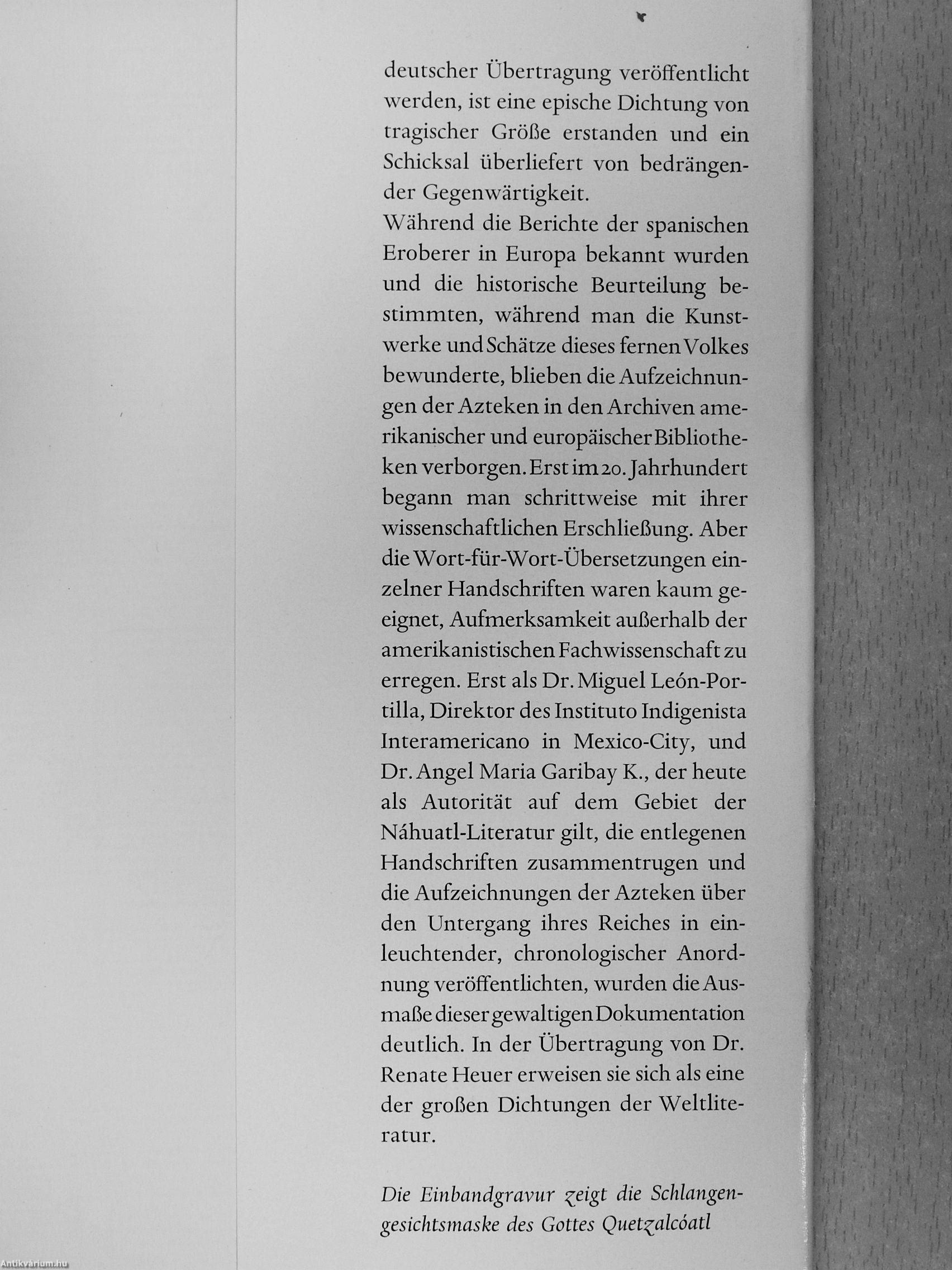 deutscher Übertragung veröffentlicht werden, ist eine epische Dichtung von tragischer Größe erstanden und ein Schicksal überliefert von bedrängender Gegenwärtigkeit. Während die Berichte der spanischen Eroberer in Europa bekannt wurden und die historische Beurteilung bestimmten, während man die Kunstwerke und Schätze dieses fernen Volkes bewunderte, blieben die Aufzeichnungen der Azteken in den Archiven amerikanischer und europäischer Bibliotheken verborgen. Erst im20. Jahrhundert begann man schrittweise mit ihrer wissenschaftlichen Erschließung. Aber die Wort-für-Wort-Übersetzungen einzelner Handschriften waren kaum geeignet, Aufmerksamkeit außerhalb der amerikanistischen Fachwissenschaft zu erregen. Erst als Dr. Miguel Le6n-Por-tilla, Direktor des Instituto Indigenista Interamericano in Mexico-City, und Dr. Angel Maria Garibay K., der heute als Autorität auf dem Gebiet der Nähuatl-Literatur gilt, die entlegenen Handschriften zusammentrugen und die Aufzeichnungen der Azteken über den Untergang ihres Reiches in einleuchtender, chronologischer Anordnung veröffentlichten, wurden die Ausmaße dieser gewaltigen Dokumentation deutlich. In der Übertragung von Dr. Renate Heuer erweisen sie sich als eine der großen Dichtungen der Weltlite-