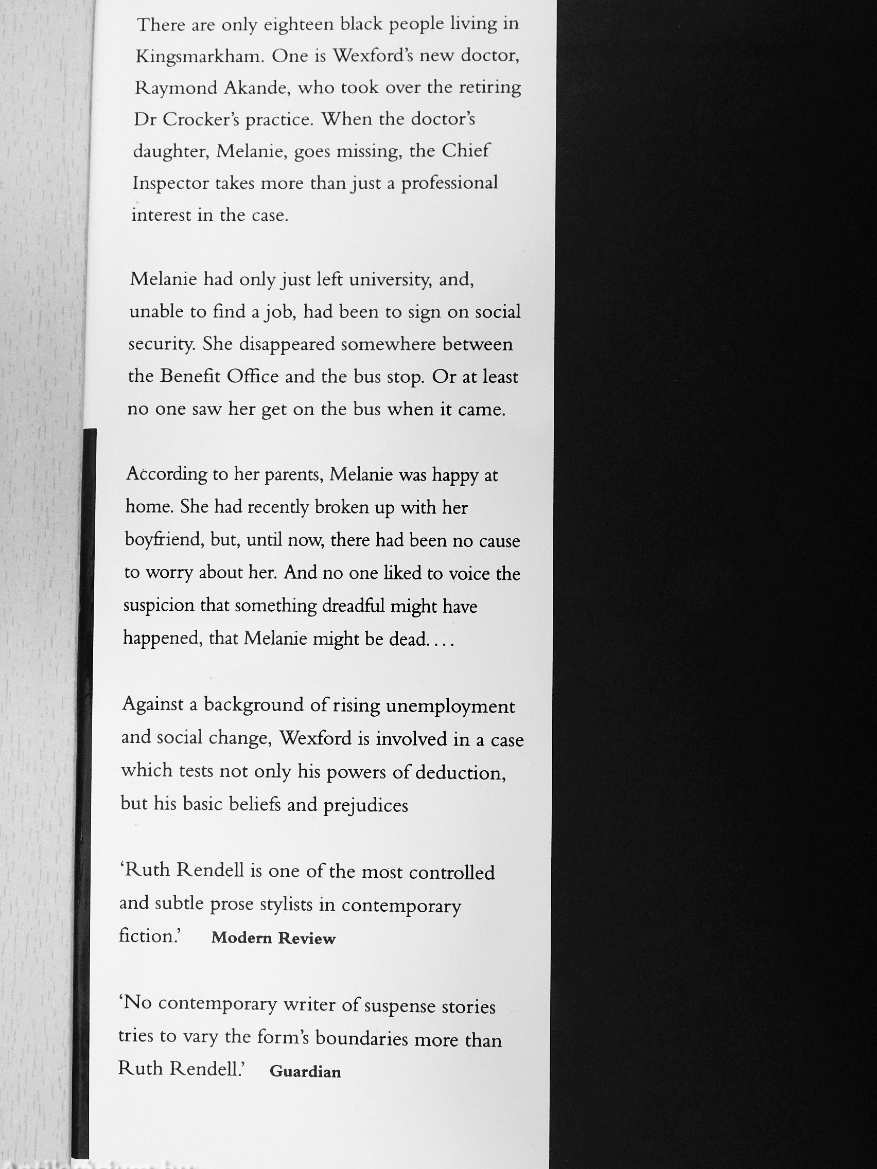 There are only eighteen black people living in Kingsniarkham. One is Wexford's new doctor, Raymond Akande, who took over the retiring Dr Crocker's practice. When the doctor's daughter, Melanie, goes missing, the Chief Inspector takes more than just a professional interest in the case.
