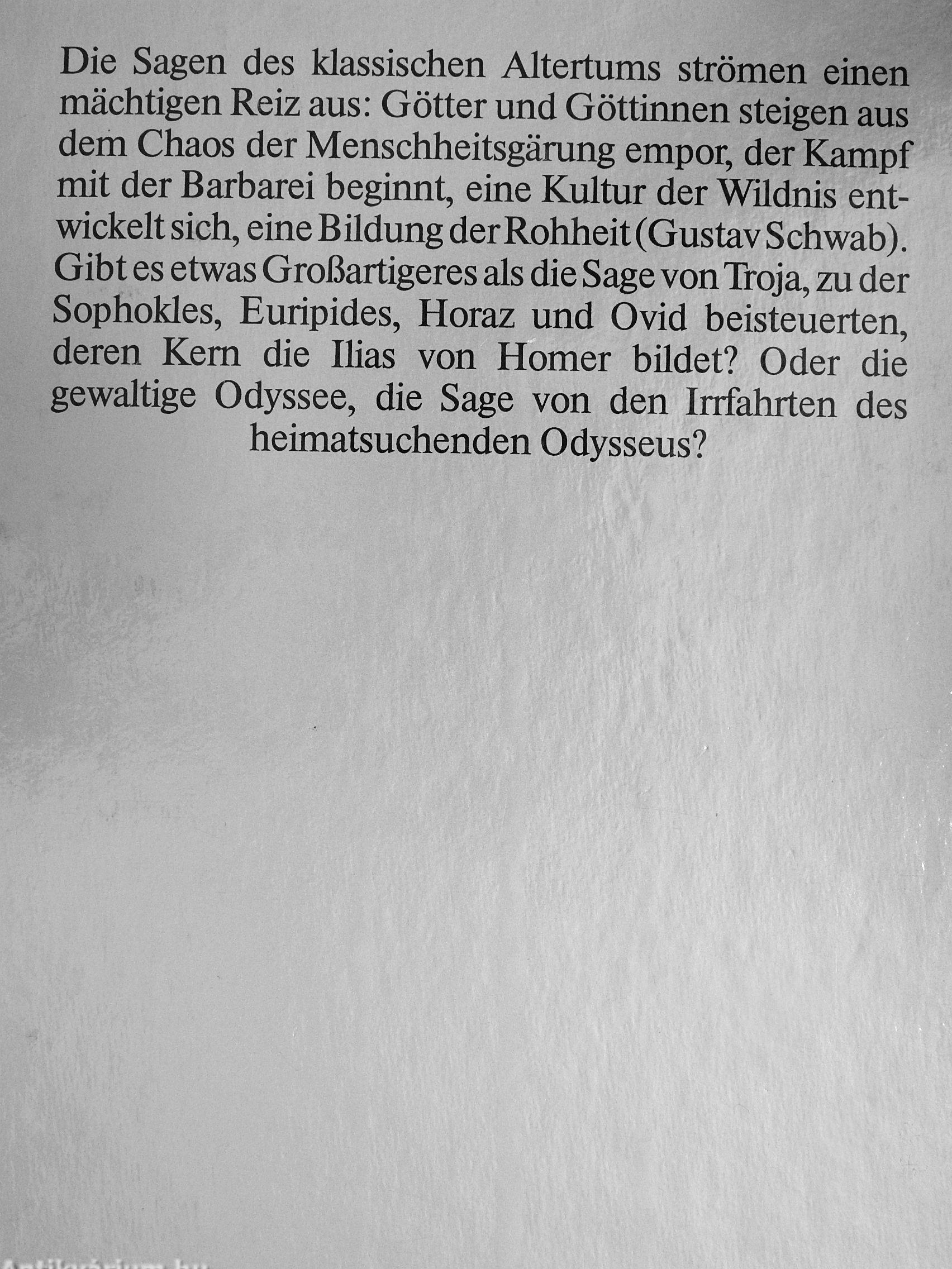 Die Sagen des klassischen Altertums strömen einen mächtigen Reiz aus: Götter und Göttinnen steigen aus dem Chaos der Menschheitsgärung empor, der Kampf mit der Barbarei beginnt, eine Kultur der WUdnis entwickelt sich, eine Bildung der Rohheit (Gustav Schwab). Gibt es etwas Großartigeres als die Sage von Troja, zu der Sophokles, Euripides, Horaz und Ovid beisteuerten, deren Kern die Ilias von Homer bildet? Oder die gewaltige Odyssee, die Sage von den Irrfahrten des heimatsuchenden Odysseus?