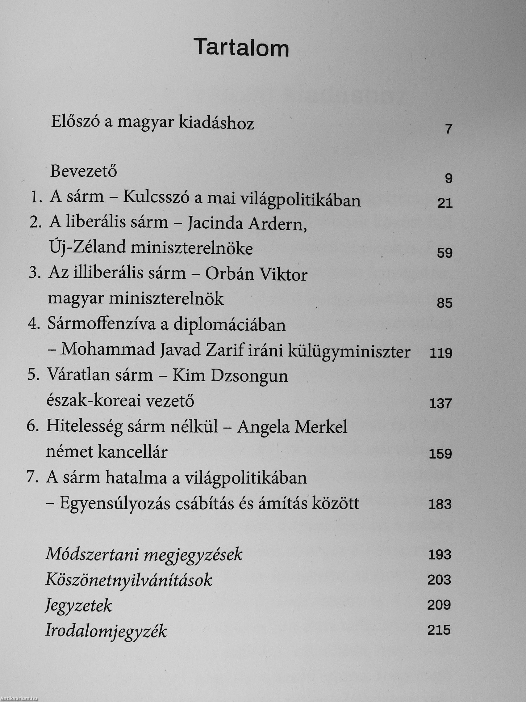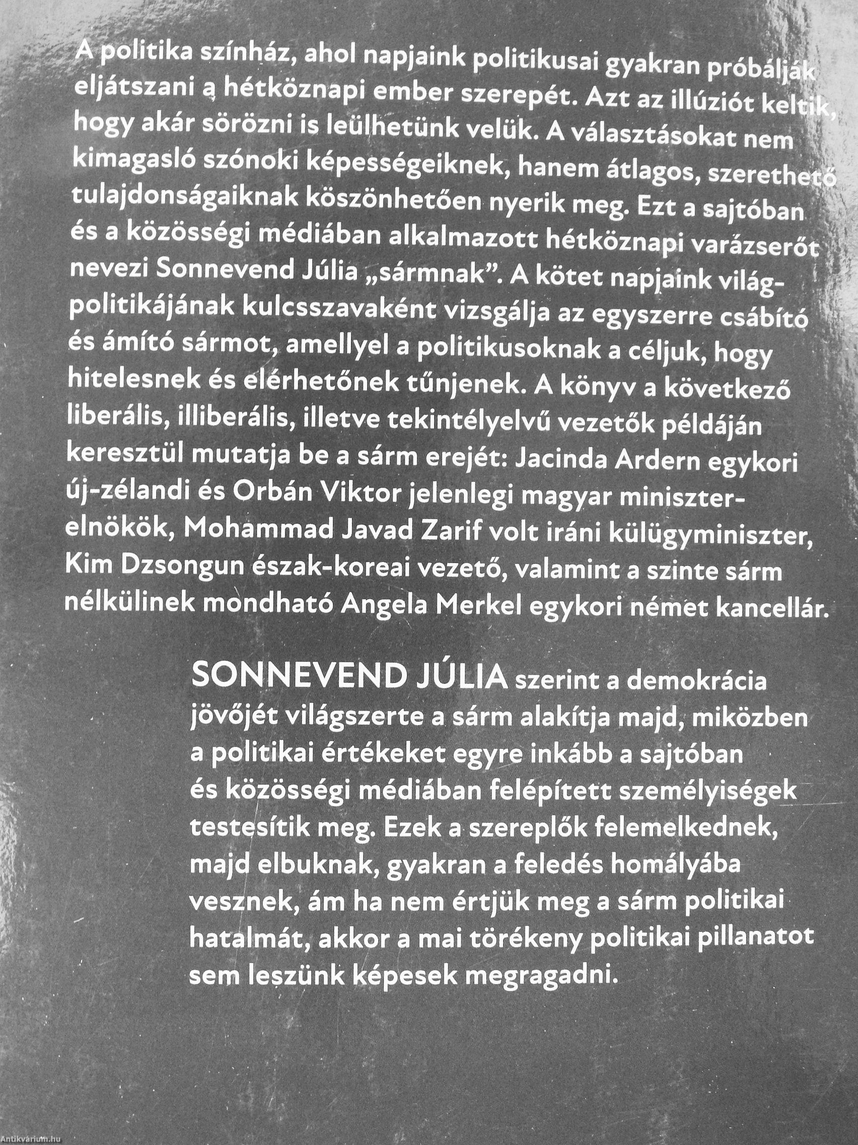 A politika színház, ahol napjaink politikusai gyakran próbalí^ eljátszani ^ hétköznapi ember szerepét. Azt az Illúziót kelt:L, hogy akár sörözni is leülhetünk velük. A választásokat nem ' kimagasló szónoki képességeiknek, hanem átlagos, szerethe^c tulajdonságaiknak köszönhetően nyerik meg. Ezt a sajtóban ^ és a közösségi médiában alkalmazott hétköznapi varázserőtff nevezi Sonnevend Júlia„sármnak". A kötet napjaink világ-politikájának kulcsszavaként vizsgálja az egyszerre csábító ^^ és ámító sármot, amellyel a politikusoknak a céljuk, hogy I n hitelesnek és élérhetőnek tűnjenek. A könyv a következő ' ^ liberális, illiberális, illetve tekintélyelvű vezetők példáján 1 keresztül mutatja be a sárm erejét: Jacinda Ardern egykori új-zélandi és Orbán Viktor jelenlegi magyar miniszterelnökök, Mohammad Javad Zarif volt iráni külügyminiszter, Kim Dzsongun észak-koreai vezető, valamint a szinte sárm nélkülinek mondható Angéla Merkel egykori némét kancellár.