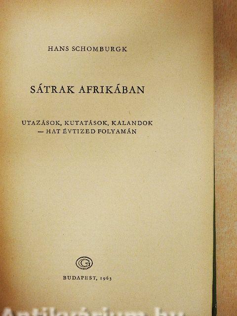 Hans Schomburgk, a híres német Afrika-kutató oroszlánvadász nevét jól ismeri a magyar olvasóközönség "A vadon érverése" c., az utóbbi években több kiadást megért könyvéből. A "Sátrak Afrikában" a szerző tizedik, 1956-os afrikai útjáról szól, amelynek folyamán Fokvárosból Ugandán keresztül Monbasáig járta be a Fekete-földrészt.