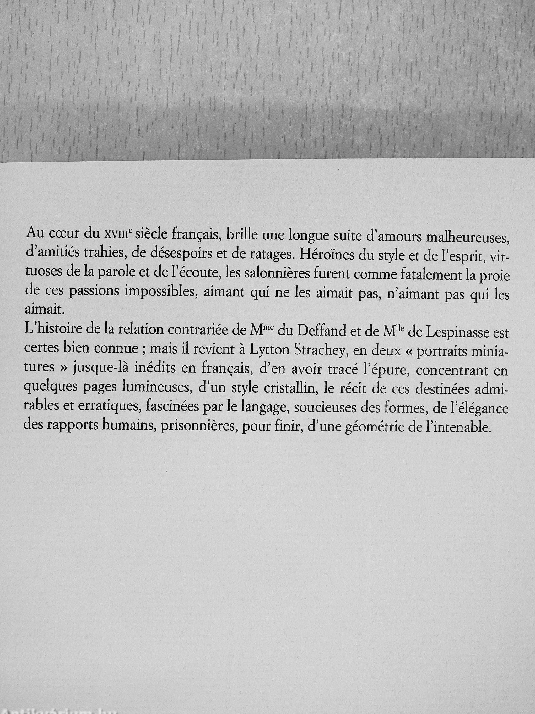 L'histoire de la relation contrariée de M""^ du Deffand et de M"'^ de Lespinasse est certes bien connue ; mais il revient a Lytton Strachey, en deux « portraits miniatures » jusque-la inédits en français, d'en avoir tracé l'épure, concentrant en quelques pages lumineuses, d'un style cristallin, le récit de ces destinées admirables et erratiques, fascinées par le langage, soucieuses des formes, de l'élégance des rapports humains, prisonnieres, pour finir, d'une géométrie de l'intenable.