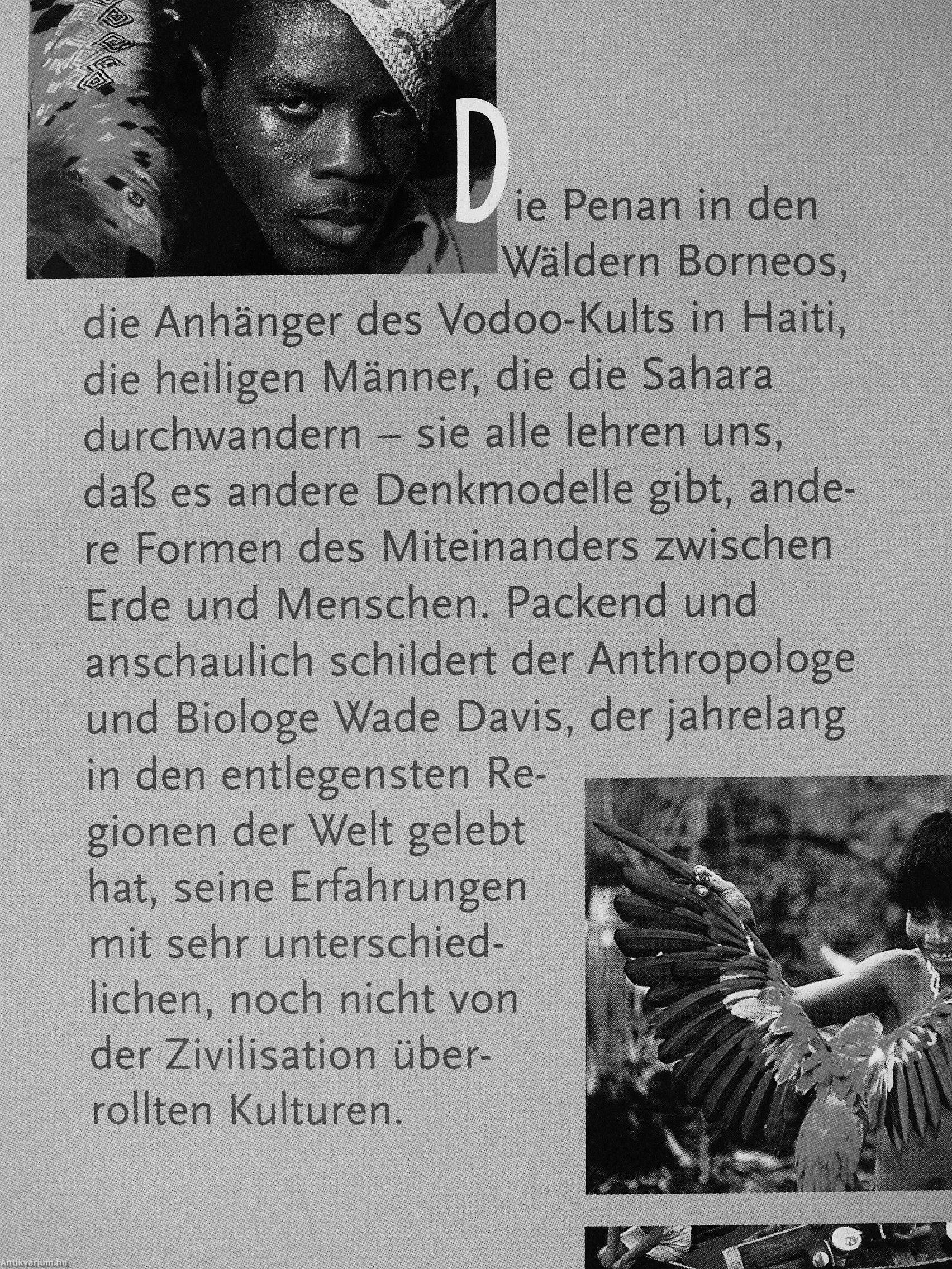 ie Penan in den 'Wäldern Borneos, die Anhänger des Vodoo-Kults in Haiti, die heiligen Männer, die die Sahara durchwandern - sie alle lehren uns, daß es andere Denkmodelle gibt, andere Formen des Miteinanders zwischen Erde und Menschen. Packend und anschaulich schildert der Anthropologe und Biologe Wade Davis, der jahrelang in den entlegensten Regionen der Welt gelebt hat, seine Erfahrungen mit sehr unterschiedlichen, noch nicht von der Zivilisation überrollten Kulturen.