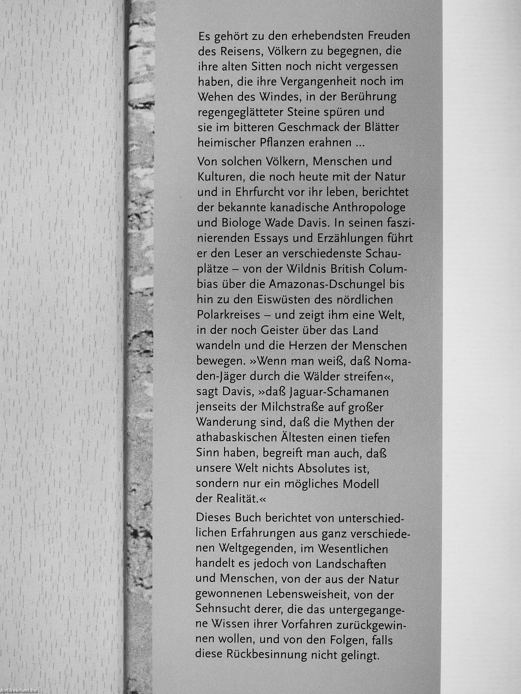 Es gehört zu den erhebendsten Freuden des Reisens, Völkern zu begegnen, die ihre alten Sitten noch nicht vergessen haben, die ihre Vergangenheit noch im Wehen des Windes, in der Berührung regengeglätteter Steine spüren und sie im bitteren Geschmack der Blätter heimischer Pflanzen erahnen Von solchen Völkern, Menschen und Kulturen, die noch heute mit der Natur und in Ehrfurcht vor ihr leben, berichtet der bekannte kanadische Anthropologe und Biologe Wade Davis. In seinen faszinierenden Essays und Erzählungen führt er den Leser an verschiedenste Schauplätze - von der Wildnis British Columbias über die Amazonas-Dschungel bis hin zu den Eiswüsten des nördlichen Polarkreises - und zeigt ihm eine Welt, in der noch Geister über das Land wandeln und die Herzen der Menschen bewegen. »Wenn man weiß, daß Nomaden-Jäger durch die Wälder streifen«, sagt Davis, »daß jaguar-Schamanen jenseits der Milchstraße auf großer Wanderung sind, daß die Mythen der athabaskischen Ältesten einen tiefen Sinn haben, begreift man auch, daß unsere Welt nichts Absolutes ist, sondern nur ein mögliches Modell der Realität.«
