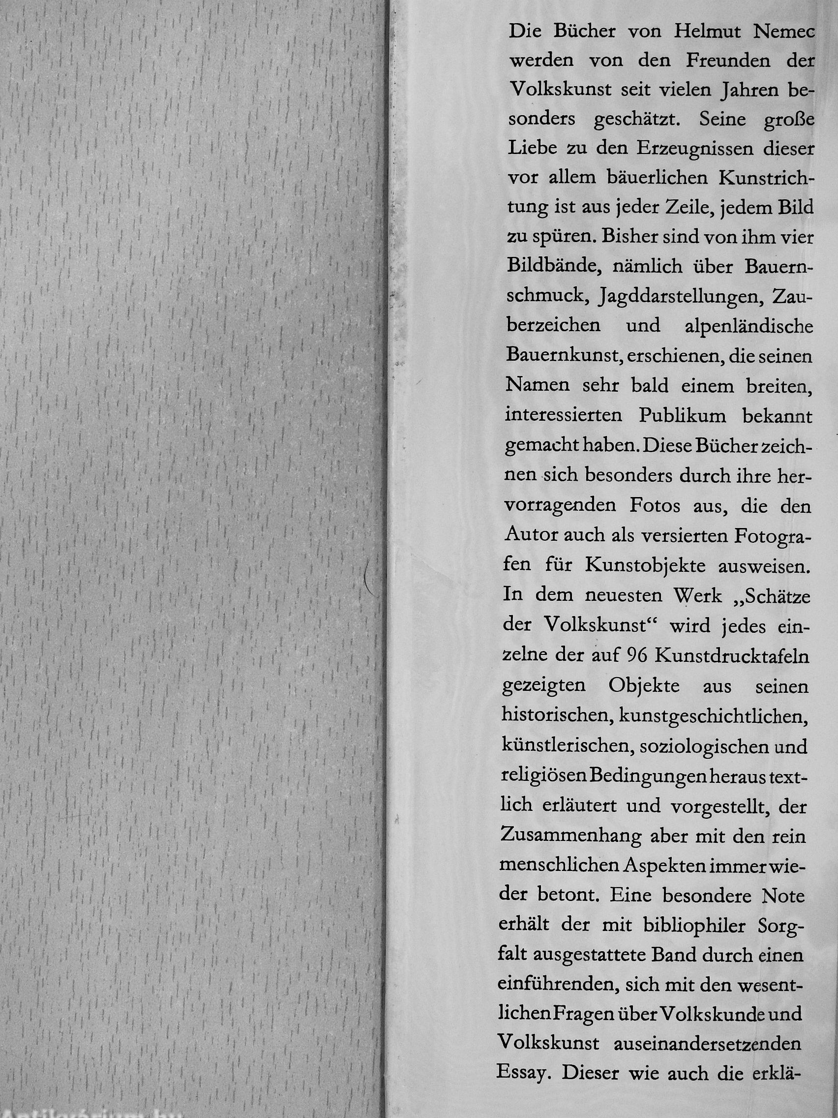 Die Bücher von Helmut Nemec ' werden von den Freunden der Volkskunst seit vielen Jahren besonders geschätzt. Seine große Liebe zu den Erzeugnissen dieser vor allem bäuerlichen Kunstrichtung ist aus jeder Zeile, jedem Bild zu spüren. Bisher sind von ihm vier Bildbände, nämlich über Bauernschmuck, Jagddarstellungen, Zauberzeichen und alpenländische Bauernkunst, erschienen, die seinen Namen sehr bald einem breiten, interessierten Publikum bekannt gemacht haben. Diese Bücher zeichnen sich besonders durch ihre hervorragenden Fotos aus, die den Autor auch als versierten Fotografen für Kunstobjekte ausweisen. In dem neuesten Werk „Schätze der Volkskunst" wird jedes einzelne der auf 96 Kunstdrucktafeln gezeigten Objekte aus seinen historischen, kunstgeschichtlichen, künstlerischen, soziologischen und religiösen Bedingungen heraus textlich erläutert und vorgestellt, der Zusammenhang aber mit den rein menschlichen Aspekten immer wieder betont. Eine besondere Note erhält der mit bibliophiler...