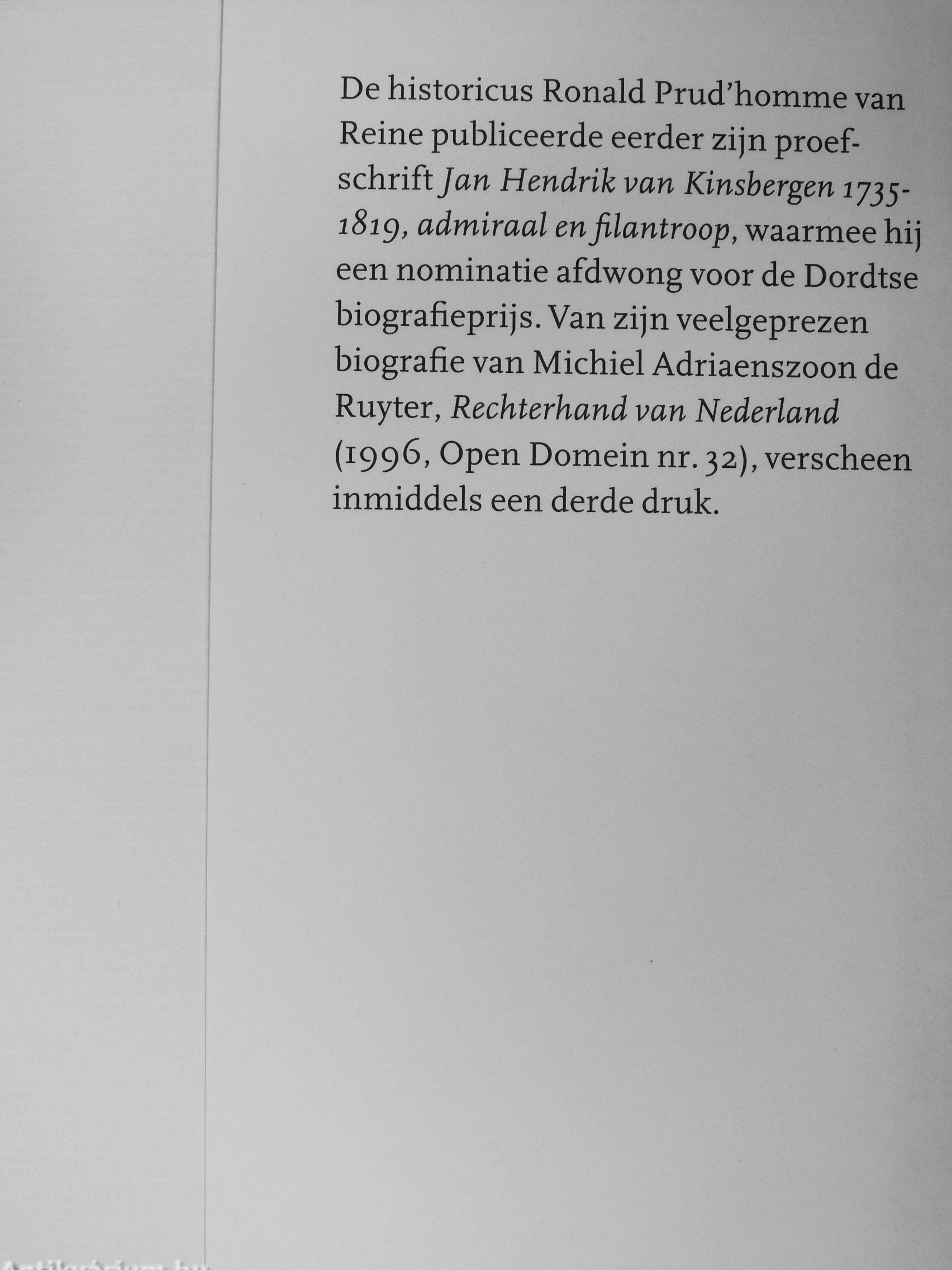De historicus Ronald Prud'homme van Reine publiceerde eerder zijn proef-schrift Jan Hendrik van Kinsbergen lyjy 181 g, admiraal enjilantroop, waarmee hij een nominatie afdwong voor de Dordtse biografieprijs. Van zijn veelgeprezen biografié van Michiel Adriaenszoon de Ruyter, Rechterhand van Nederland (1996, Open Domein nr. 32), verscheen inmiddels een derde druk.