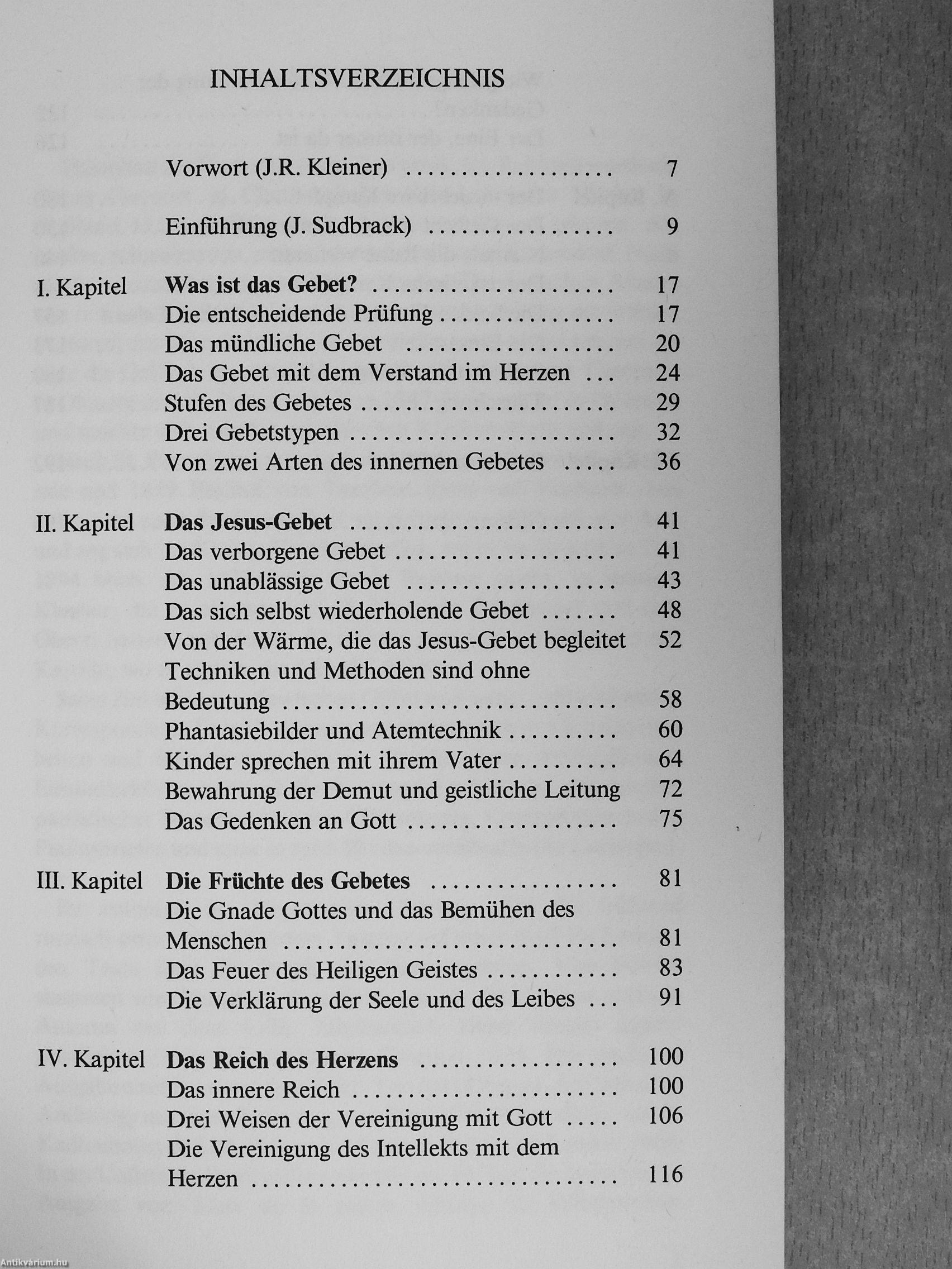 Ein Meister der Spiritualität führt hier Schritt für Schritt in den Vollzug des Herzens- bzw. Jesusgebetes ein. Er entdeckt in diesem Gebet einen ungeheueren Reichtum für den Lebens- und Gaubensvollzug aus der Mitte des Herzens und zieht den Leser in eine große Geborgenheitserfahrung hinein.