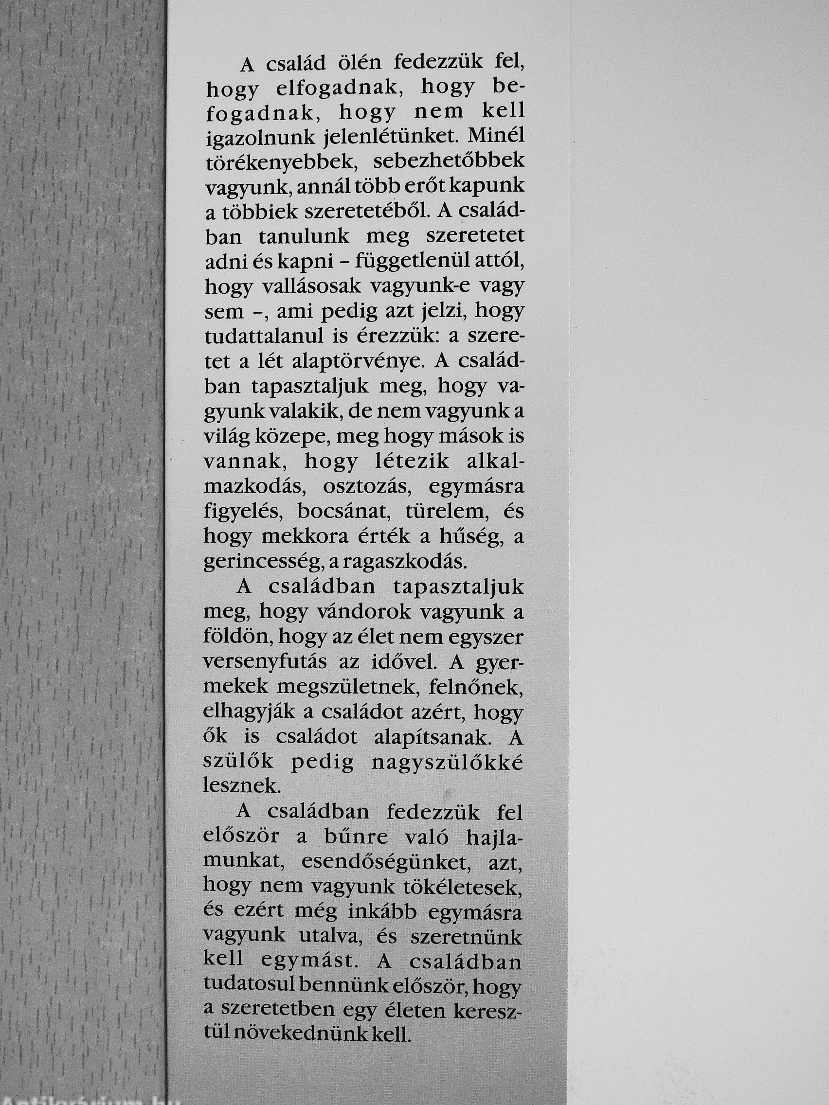 A család ölén fedezzük fel, hogy elfogadnak, hogy befogadnak, hogy nem kell igazolnunk jelenlétünket. Minél törékenyebbek, sebezhetőbbek vagyunk, annál több erőt kapunk a többiek szeretetéből. A családban tanulunk meg szeretetet adni és kapni - függetlenül attól, hogy vallásosak vagyunk-e vagy sem -, ami pedig azt jelzi, hogy tudattalanul is érezzük: a szeretet a lét alaptörvénye. A családban tapasztaljuk meg, hogy vagyunk valakik, de nem vagyunk a világ közepe, meg hogy mások is vannak, hogy létezik alkalmazkodás, osztozás, egymásra figyelés, bocsánat, türelem, és hogy mekkora érték a hűség, a gerincesség, a ragaszkodás.