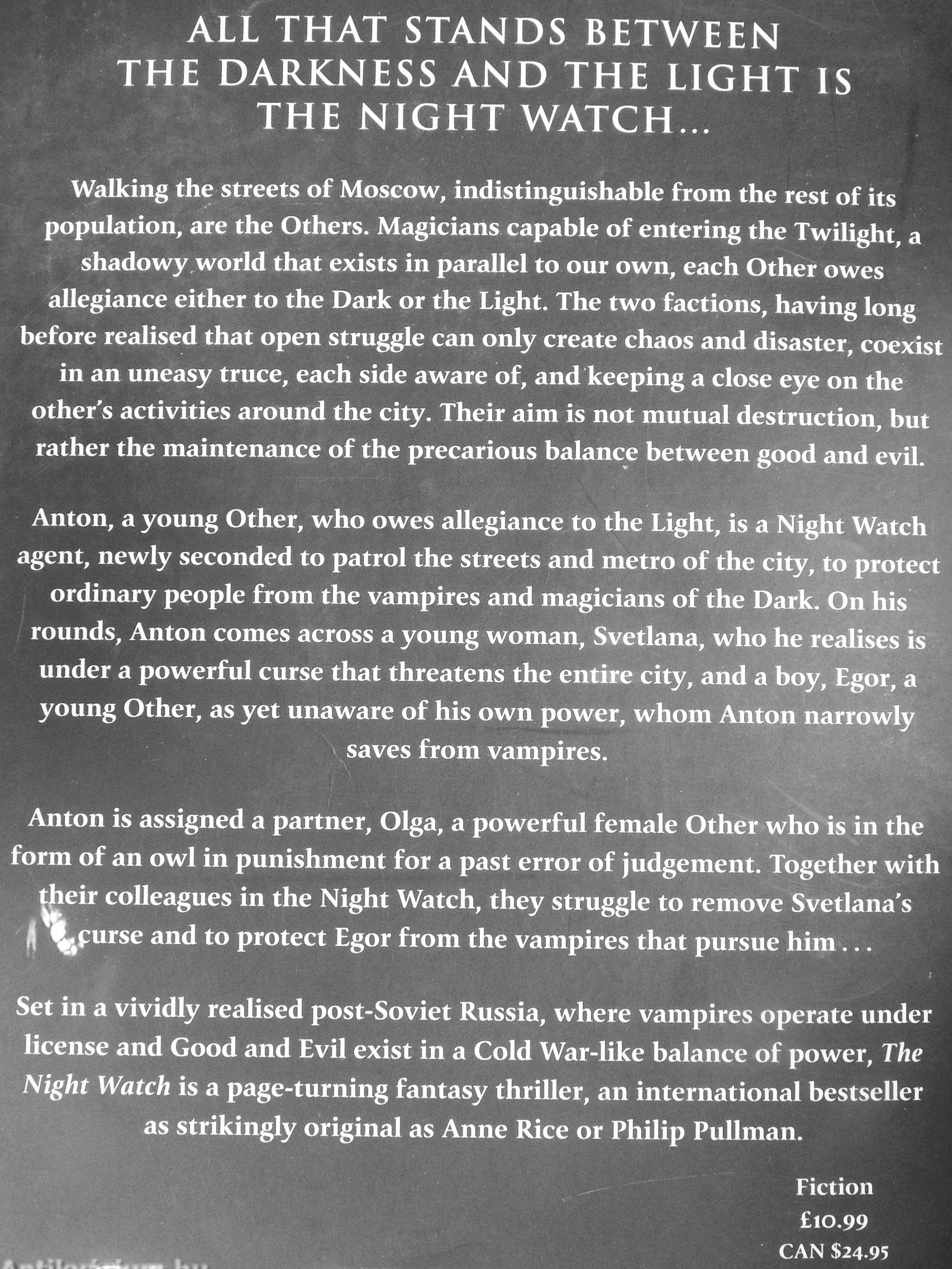 Set in a vividly realised post-Soviet Russia, where vampires operate under license and Good and Evil exist in a Cold War-like balance of power. The Night Watch is a page-turning fantasy thriller, an international bestseller as strikingly original as Anne Rice or Philip Pullman.