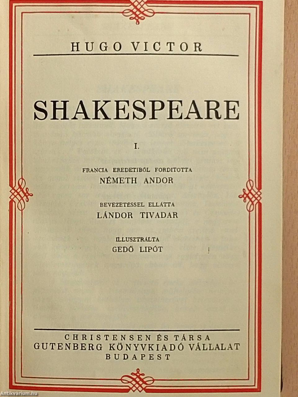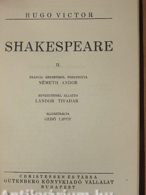 Az angol iró-óriás neve, amely Hugo Viktor e müvének élén áll, nem fejezi ki hiven e bámulatos irói alkotás tartalmát. Maga a szerző állapitja ezt meg, mondván hátrább olvasható előljáró soraiban, hogy a könyv helyes cime inkább ez lenne: "Shakespeare-ről szólva..." Valóban, ez a rendkivüli mü nem pusztán Shakespeare méltatása, hanem az emberi géniusz legmagasabb ormainak megmutatása az irodalom terén. Az angol szellemóriásból indul ki, de pártját, hasonmását keresve felvonul lelki szeme előtt az emberiségnek egész sor iró-óriása: Homéros, Aischylos, Jób, Ézsaiás, Ezékiel, Pál apostol, Lucretius, Juvenalis, Tacitus, Szent János, Dante, Rabelais és Cervantes alakja. Hugo Viktort magával ragadják e nagyszerű látomások, rájut, hogy van az emberi szellem emelkedésének egy határa, amelyen tul elvesznek a fokozati különbségek, s amelyik emberi elme fölemelkedett ebbe a régióba, az valamennyi egyképpen nagy, s valamennyinek nagysága abba áll, hogy nincsen nála nagyobb.