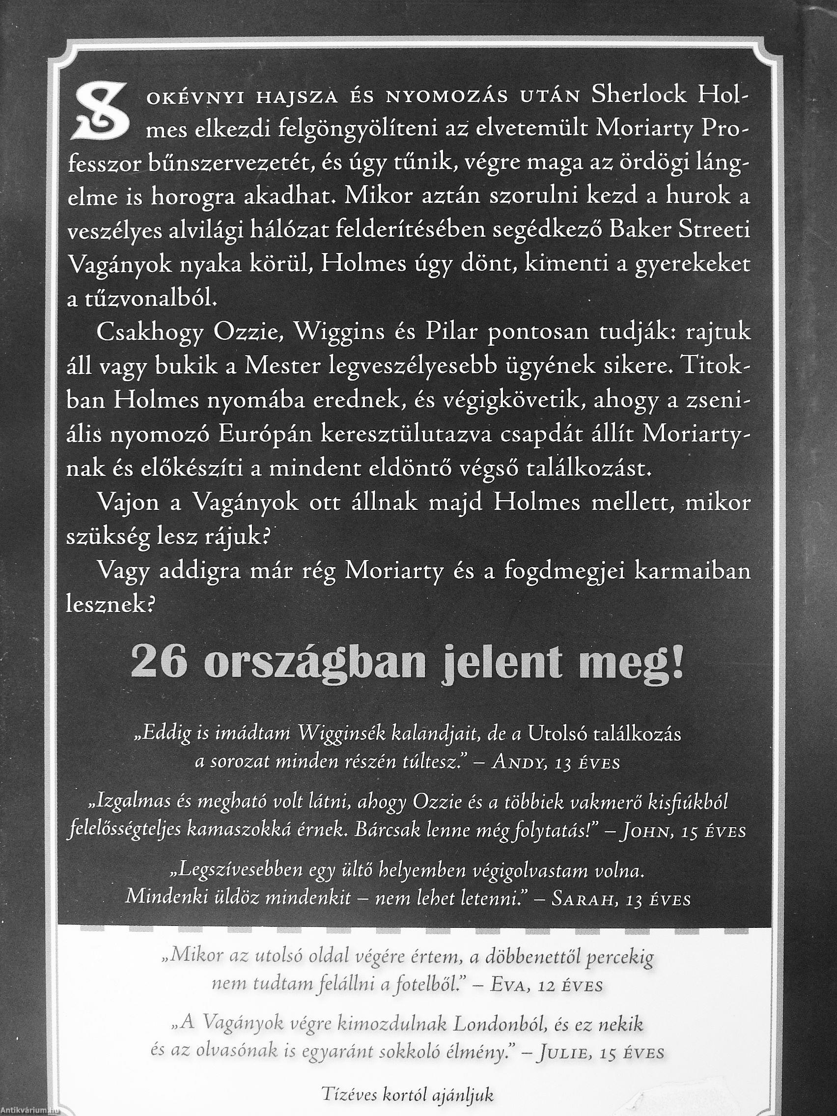 Csakhogy Ozzie, Wiggins és Pilar pontosan tudják: rajtuk áll vagy bukik a Mester legveszélyesebb ügyének sikere. Titokban Holmes nyomába erednek, és végigkövetik, ahogy a zseniális nyomozó Európán keresztülutazva csapdát állít Moriarty-nak és előkészíti a mindent eldöntő végső találkozást.