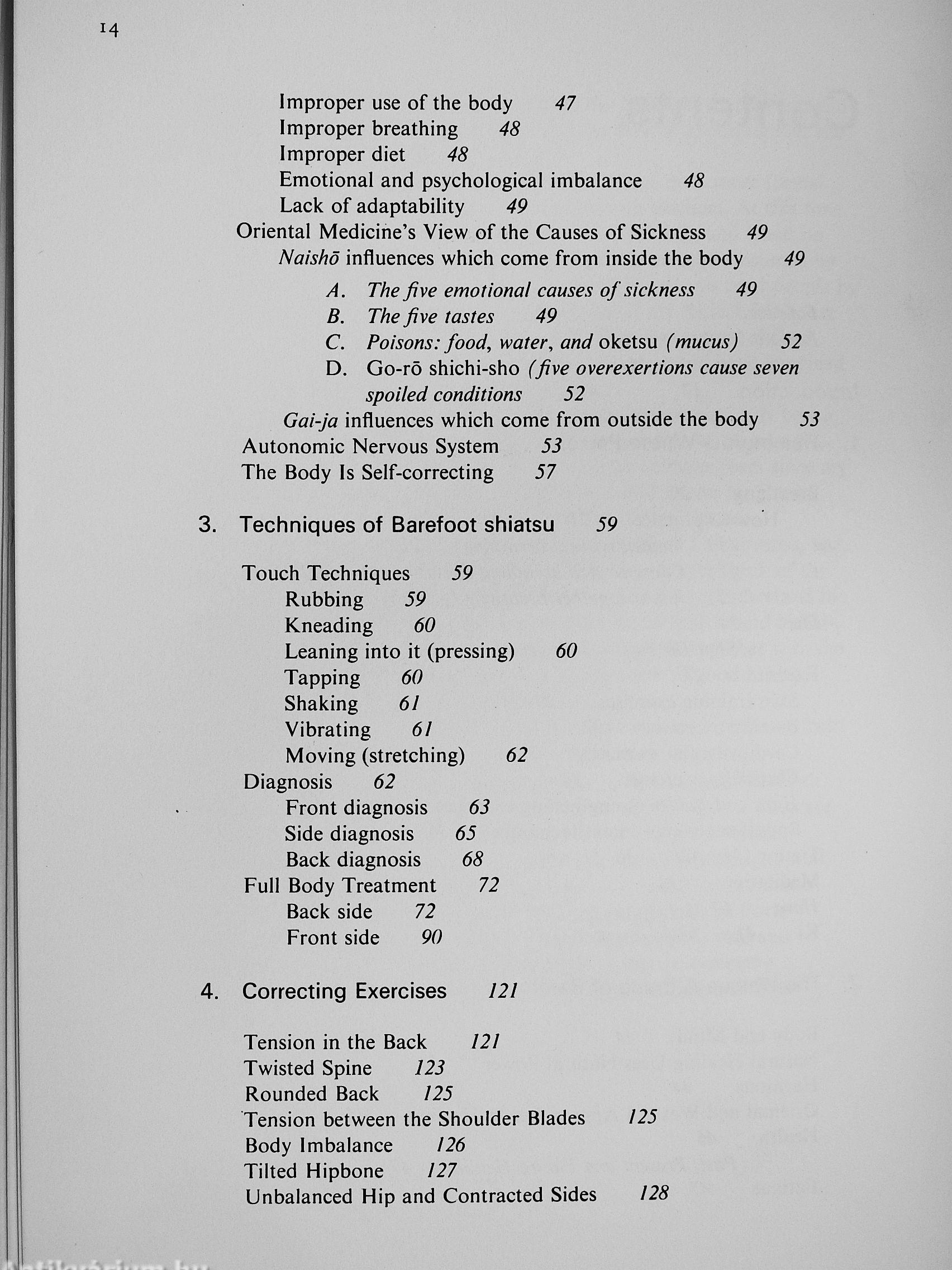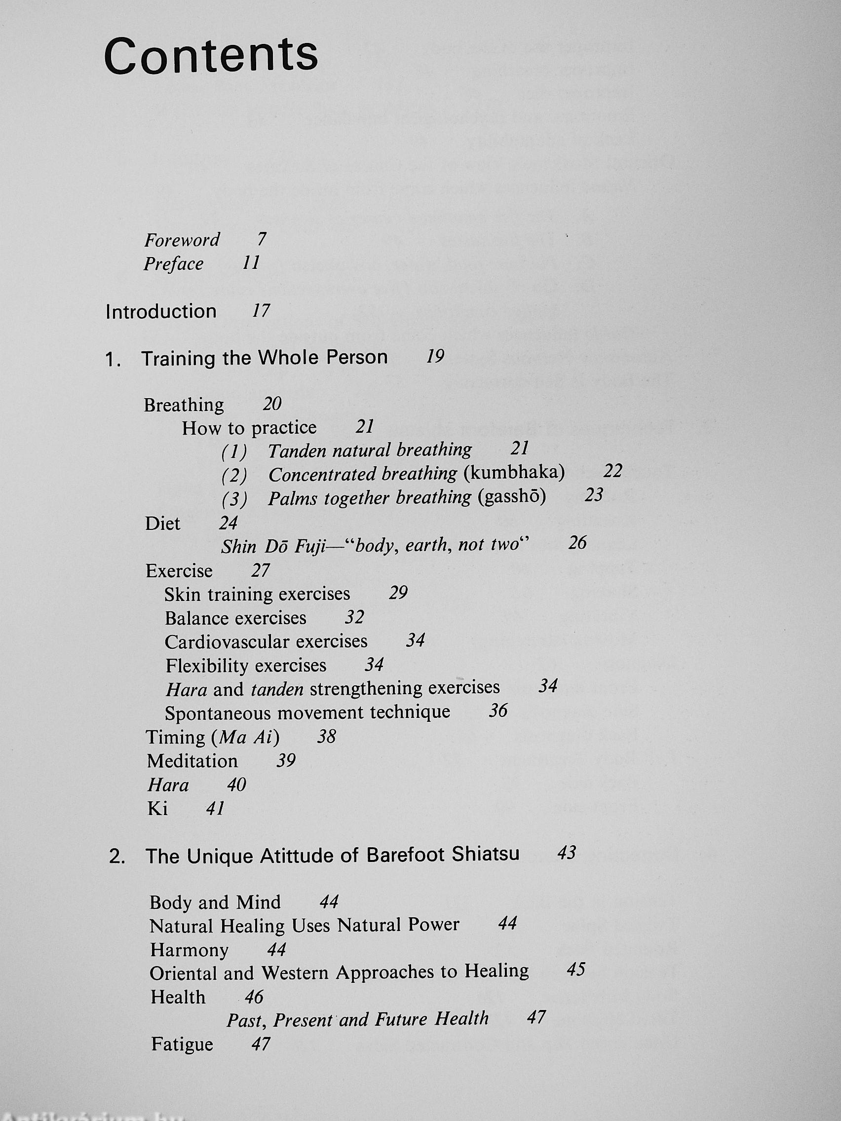 It is easier to keep a problem from developing, however, than to stop in once its symptoms become obvious. Thus, shiatsu offers its clients advice concerning diet, exercise, meditation, and relaxation. In these times of increased stress, the practice and philosophy of shiatsu represent a valued contribution of the eastern world to the western world. The United States has not been entirely deficient as regards some of Shizuko Yamamoto's practices, however. Benjamin Franklin took "air baths" in the 1700s, portraying them in a way quite similar to the description the reader will find in Barefoot Shiatsu!