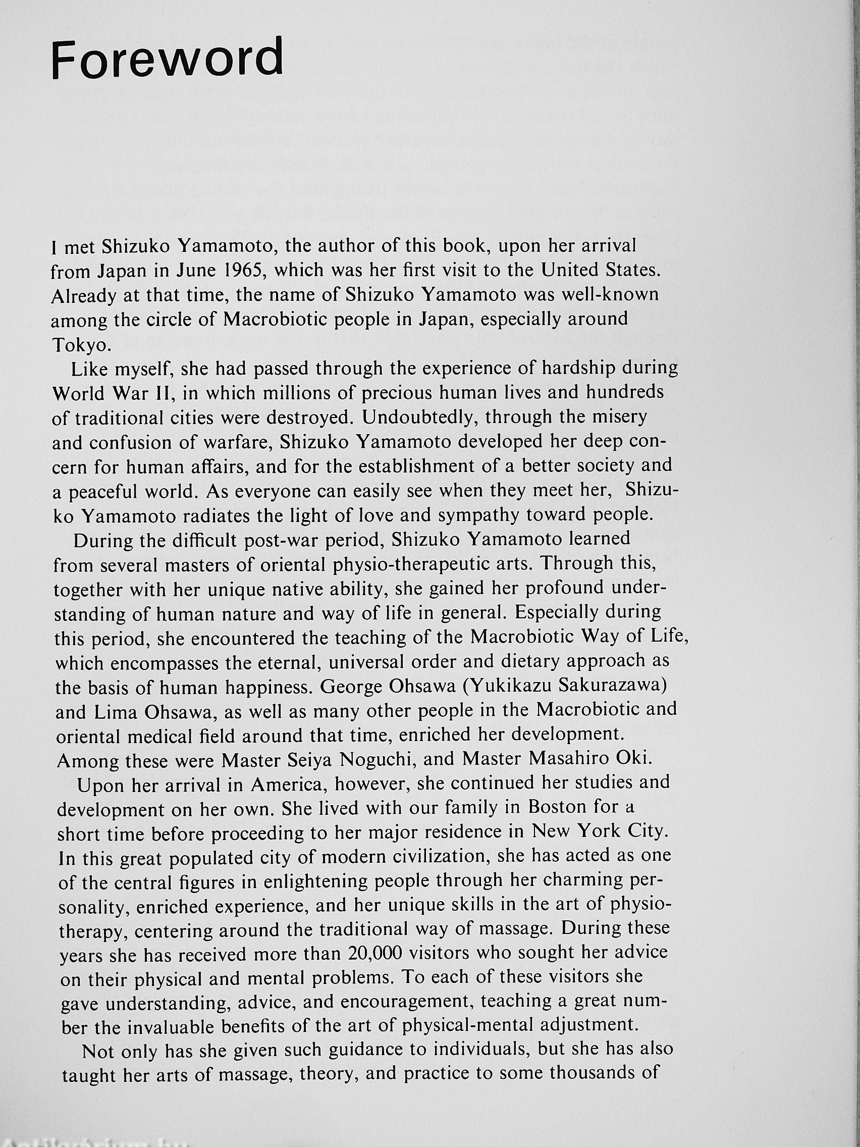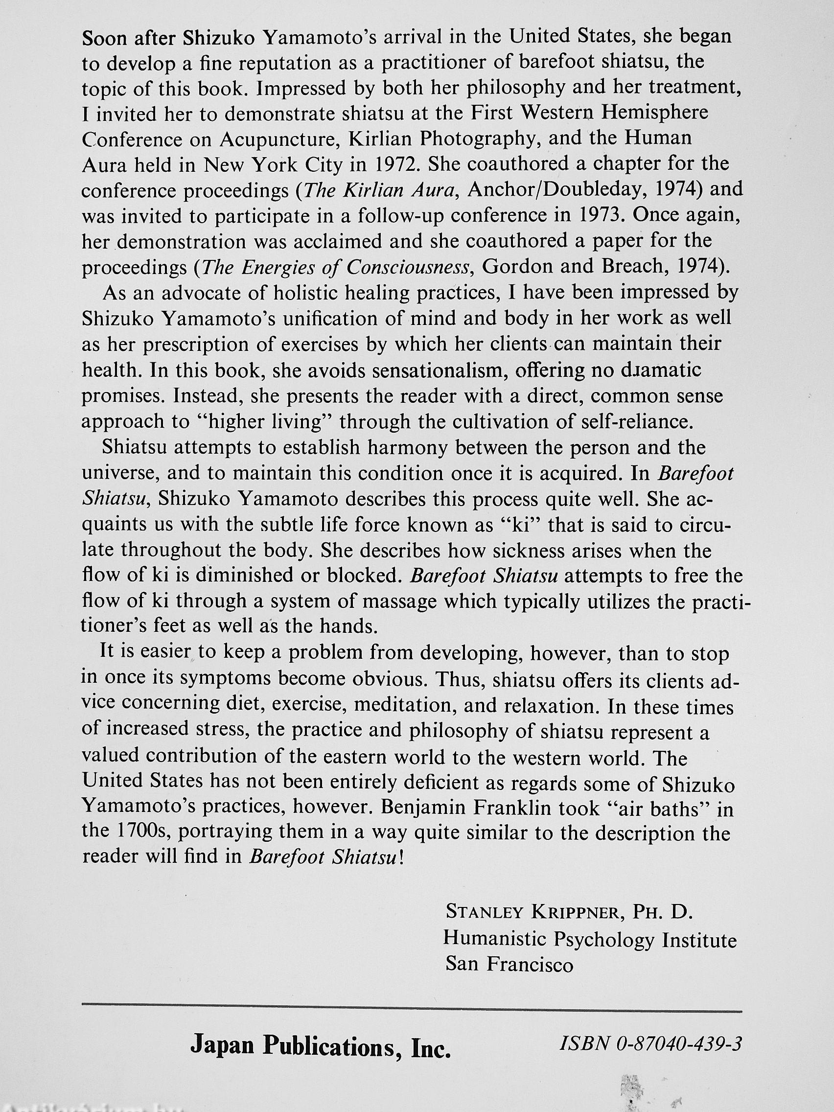 Soon after Shizuko Yamamoto's arrival in the United States, she began to develop a fine reputation as a practitioner of barefoot shiatsu, the topic of this book. Impressed by both her philosophy and her treatment, I invited her to demonstrate shiatsu at the First Western Hemisphere Conference on Acupuncture, Kirlian Photography, and the Human Aura held in New York City in 1972. She coauthored a chapter for the conference proceedings {The Kirlian Aura, Anchor/Doubleday, 1974) and was invited to participate in a follow-up conference in 1973. Once again, her demonstration was acclaimed and she coauthored a paper for the proceedings {The Energies of Consciousness, Gordon and Breach, 1974).